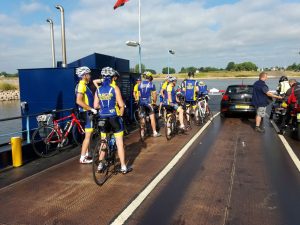 Na de koffie fietsen we via mooie weggetjes weer naar de IJssel. De Wilhelminabrug bij Deventer nemen we in een mooi tempo. We wurmen ons door het verkeer in Deventer, waarbij stoplichten niet zijn afgestemd op wielrengroepen van 14. Een paar keer even op elkaar wachten dus. Bij Epse, inmiddels ten zuiden van de A1 laten we de stoplichten achter ons . De Dortherweg is enige tijd geleden nieuw geasfalteerd. Prima natuurlijk, maar de berm naast het asfalt ligt zeker 10 cm lager. Op een stuk waar het asfalt opeens smaller wordt schieten er een paar van ons die achterin de groep fietsen in de berm. Dat gebeurt nog een keer als een landbouwvoertuig passeert en we snel in een lintje moeten. Even schrikken, maar gelukkig geen schade aan lijf en fiets.