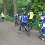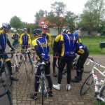 We hebben de gang er mooi in, maar wat de snelheid precies is weet ik niet omdat mijn teller kwijt is. Wel weet ik dat ik het verzet wat ik nu draai, dit seizoen nog niet vaak heb gebruikt. Maar dan rijd Peter Kamans lek. Dat men bij onze club elkaar graag helpt blijkt wel weer, want Peter kan met plezier toekijken hoe zijn band vakkundig met drie man wordt vervangen.