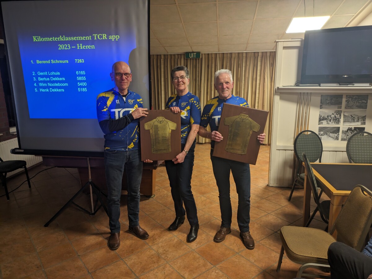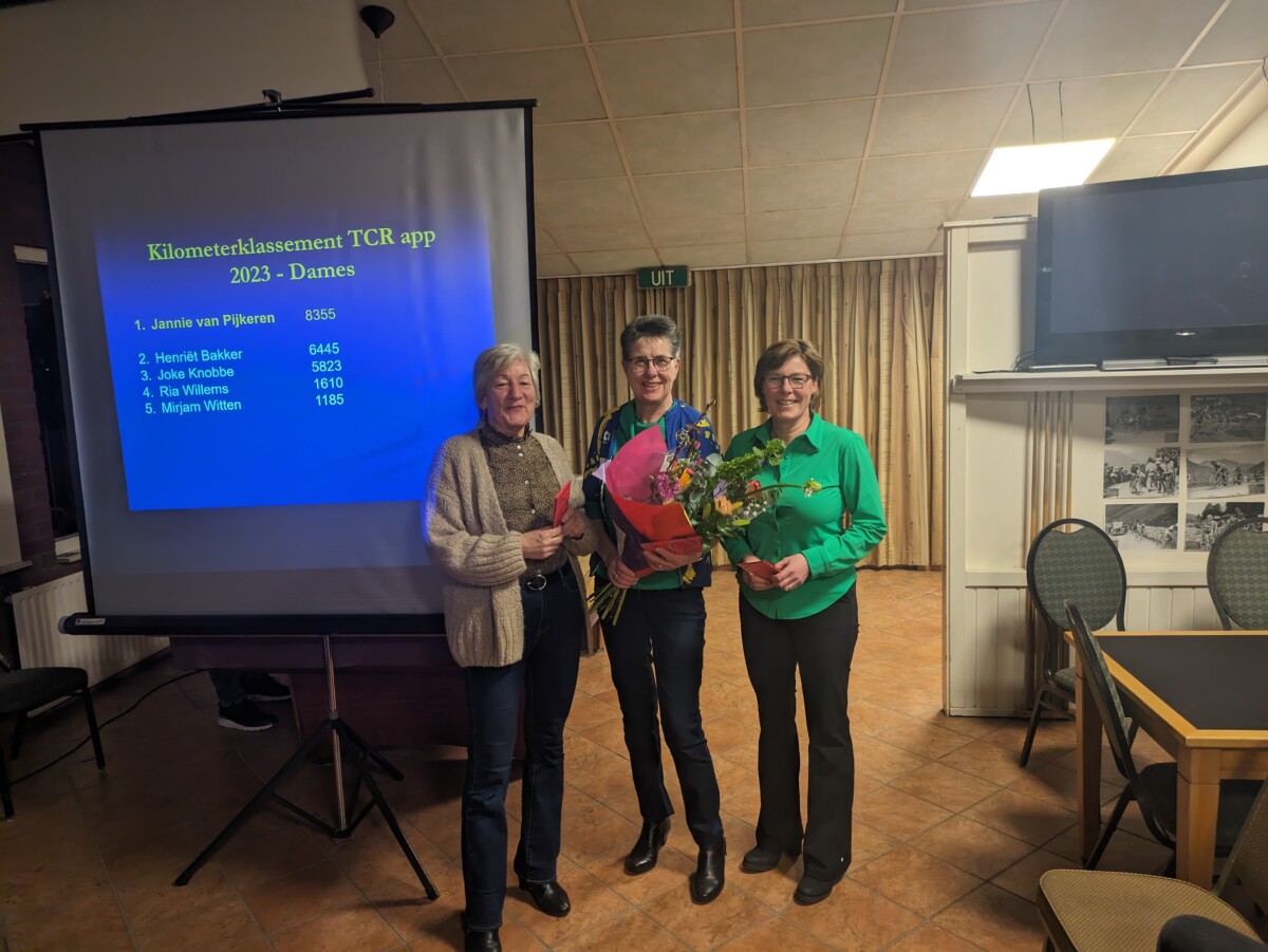 En natuurlijk ook een winnaar bij heren. Dat is Berend Schreurs met 7263 km.Daarna worden de 40-jarig jubilarissen in het zonnetje gezet. Dat zijn Louis ter Beest, Tonny ter Beest en Albert Haarkamp.