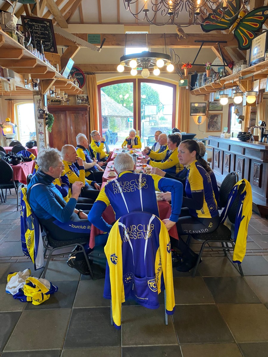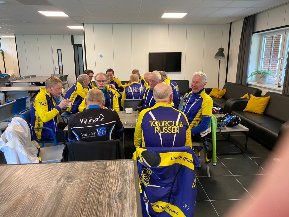 De erwtensoep staat al voor ons klaar en die gaat er prima in. Johan krijgt een telefoontje dat T2/3 later komen ivm wat probleempjes en dat even door wil geven. De atb-ers zitten al binnen en ook T1 en T7 en langzaam komen ook de andere groepen binnendruppelen. Je ziet iedereen genieten van de lekkere warme erwtensoep. Want na zo’n frisse tocht is dat zeer welkom. Voor wie wil is er ook nog wat anders te drinken. En onder het genot van een drankje kletsen we nog even met deze en gene die we het hele winterseizoen niet hebben gesproken.