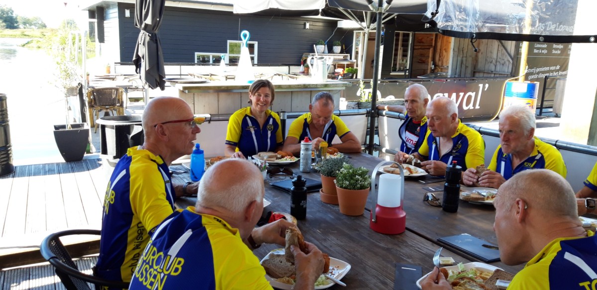 We gaan nu Ri Nunspeet en gaan door het Zandenbos mooi rustige omgeving om te fietsen. We naderen T Harde en nemen de Knobbel ook zo lekkere bult om tegenop te fietsen. Als we boven zijn gaan we door het bosgebied de Dellen. En komen bij Wapenveld aan en verlaten we de Veluwe ,en gaat het Ri de IJssel naar Whije met het pontje.Hier gaan we lunchen bij de Loswal. De calorieën zijn weer aangevuld met Cola en broodje kroket en gaan we verder voor de laatste 40 km. Om 16.15 zijn we weer in Rijssen en staan er 146 km op de teller. Gerrit namens iedereen bedankt voor deze mooie dag op naar de volgende.