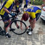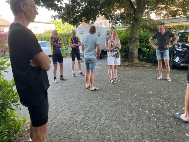 Ook dat is de ToT, er worden mooie foto’s gemaakt, maar we moeten weer door. Even later klinkt er het vervelende “LEK” en dat is wel duidelijk, Erik D heeft tubeless banden en dat spuit er nu uit. Na veel “vakkundig” advies hoe dit verholpen moet worden, met een “prop” , lukt het om het gat te dichten. Maar helaas, dit werkt maar even. Weer spuit het witte spul eruit. NU wordt er niet meer gediscussieerd maar gelijk een nieuwe binnenband er ingelegd. En dat helpt. Zo zijn we een beetje laat bij de 1e koffiestop aanbeland. Ina en Bart zitten al te wachten op een prima plekje met veel schaduw en hebben alles al klaargezet en we kunnen lekker in de schaduw de koffie en stroopwafel of wat anders lekkers pakken. Bananen of een winegummetje/dropje of reepje neem wat je lekker vind. Het is hier prettig toeven maar helaas we moeten door. Als iedereen de bidons weer heeft bijgevuld, banaan of reepje mee in de achterzak en dan kunnen we weer verder.