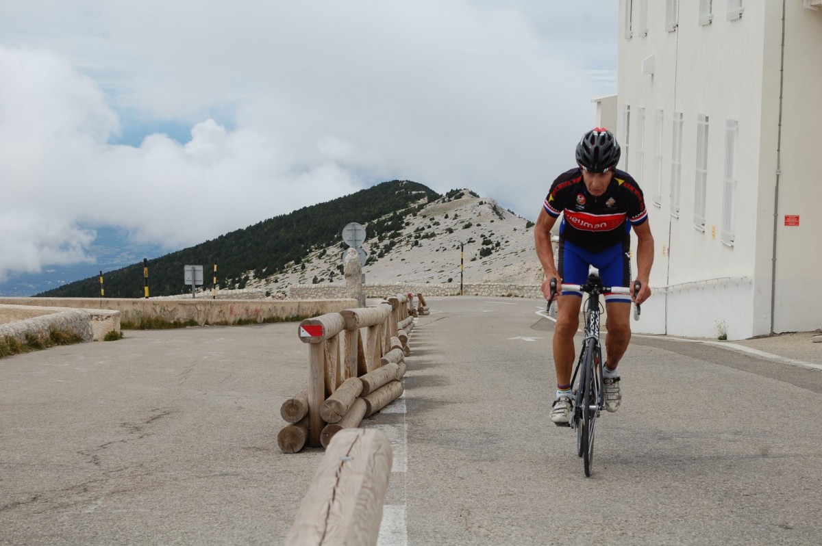 het nog een stuk frisser. Gerrit hoort 100 meter onder de top Ronny roepen dat hij boven is, hij heeft het “stervenskoud”. Gerrit parkeert de bus op de top. Ronny stort zijn bidon vol en werpt zich in de afdaling naar Malaucene, waar hij snelheden van boven de 80 km/uur ervaart. Niet veel later volgt Bart op de top, 10 min later Henk, die de laatste bocht naar de top verkeerd neemt en met de steile trap naar de bus bij de toren moet. Willy volgt op 8 minuten, op 20 minuten Henrico en niet veel later Frank.