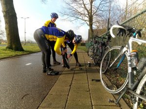 Aantal leden: 4Vanochtend gingen we met 4 dames op pad. Voor mij de eerste keer op de racefiets. Best wennen na een heel seizoen op de mountainbike crossen door het bos. Nu probeerde ik elk takje, steentje en andere obstakels te ontwijken, bang om lek te rijden met die dunne bandjes. We fietsen via Goor naar Diepenheim. Daarna door Markvelde (had ik nog nooit van gehoord, misschien toch maar wat vaker buiten Rijssen kijken). Hoe langer we onderweg zijn, hoe meer de zon gaat schijnen. Net als we Hengevelde binnenrijden… lekke band ! Mirjam, onze redder in nood, verwisselt de band alsof ze dit elke dag doet. Het was in een mum van tijd gebeurd. We vervolgen onze weg richting Bentelo en Delden. Daarna een stuk tegen de wind in richting Enter. Hier drinken we een kop koffie bij de familie Knobbe !