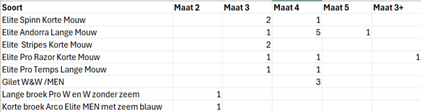 Hieronder een overzicht met de kleding en maten wat er op voorraad ligt.