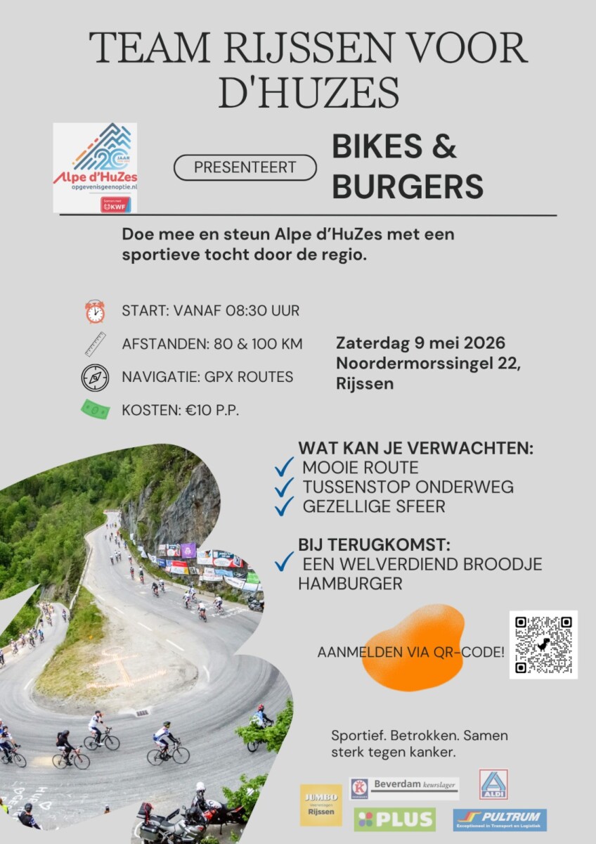 Beste leden, graag jullie aandacht voor het fantastische initiatief van onze leden Marjolein en Jan Arends. Ze maken deel uit van Team Rijssen en gaan proberen om op 6 juni zo vaak mogelijk de beroemde Alp bij Bourg d´Oisan te beklimmen. Dit indrukwekkende wielerevenement, Alpe d´HuZes zamelt jaarlijks geld in voor KWF Kankerbestrijding, en nu in 2026 staat de teller al op bijna 11 miljoen euro!