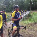 Ook nu heeft Johan de route weer zo aangepast dat we alleen maar op mooie rustige weggetjes fietsen, via Hupsel, Eibergen richting Goor. Onderweg komen we nog een wandelaar achterop die vermoedelijk aan het trainen is voor de Nijmeegse vierdaagse. Hij heeft 2 bandjes onder zijn knieën en sommigen vragen zich af waar dat voor dient.
