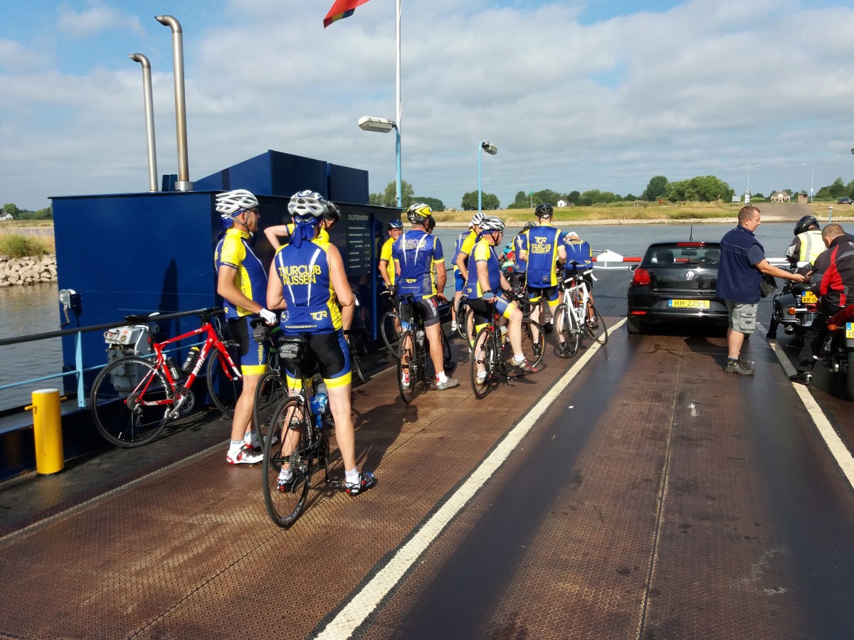 Het pontje bij Olst ligt al klaar en we kunnen er, samen met een Harley Davidson club, meteen oprijden. De IJssel ligt er mooi bij. Op de IJsseldijk van Welsum naar Terwolde geven we weer gas. De 34 kmph wordt aangetikt. We slaan af naar het westen en via de Kadijk en Beentjesweg komen we in De Vecht aan. Beschrijving van De Vecht; een kruispunt, een café, een autogarage en een paar huizen. Belangrijkste gebouw….. het café, waar we op het centrale plein van De Vecht ( het kruispunt dus) lekker buiten in het zonnetje onze koffie drinken.