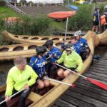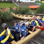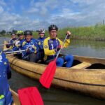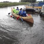 Verdeeld over 3 boten mogen we al peddelend een stuk van de rivier bevaren. De zon is er inmiddels even bij gekomen en dan is het lekker op het water.