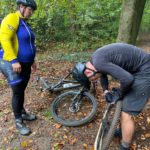 Even later op de route help Mirjam een gestrande atb-er (lek) met onze net opgedane kennis tijdens een “plakavond” om zijn band weer op peil te brengen met een patroon, het blijkt niet genoeg maar onze Duitse vrienden die weer aangefietst komen, geven het laatste zetje dat nodig is om de band weer met de juiste hoeveelheid bar te vullen.