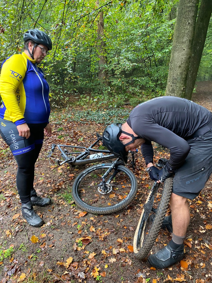 Wij kunnen weer door en laten “onze” Duitse vrienden voor want die gaan veel harder dan wij en dat blijkt: een klein stukje verder ligt een van de Duitse jongens tegen een boom, uit de bocht gevlogen. Het valt mee en even later kunnen ze weer verder.