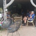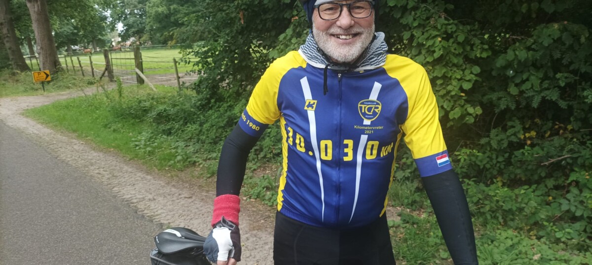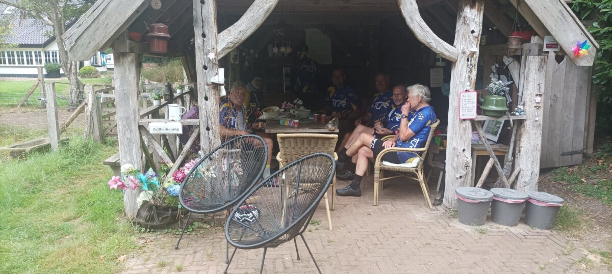 Via de Steenhaar komt het kanaal in zicht en gaan we met wind achter naar Hancate en de Regge en Archem. In Archem komen we bij rustpunt Ons Huussie om een stop te maken. Gerrit en Albert zijn de aangewezen mannen die corvee hebben en zorgen voor thee en koffie. Na plm. 30 minuten alle vacantie belevenissen te hebben gehoord stappen we weer op. Eerst nog eventjes een paar plaatjes maken en kabouter Plop van de fiets verwijderd. Op de vraag waarom hij daar zat is het nuchtere antwoord, de fiets is mij te groot en lukt het niet om met dit gezellige stelletje mee te gaan. Als we dan de koerssnelheid weer een beetje voelen, grote hilariteit. Wat blijkt daar zit een vreemdeling in de groep die alle aandacht vraagt. Door het optreden van de leiding begint een verkleed party. De Lybische vermolming van een der renners wordt afgenomen en dan komt Bertie te voorschijn. Grote pret en doel bereikt.
