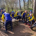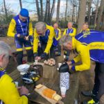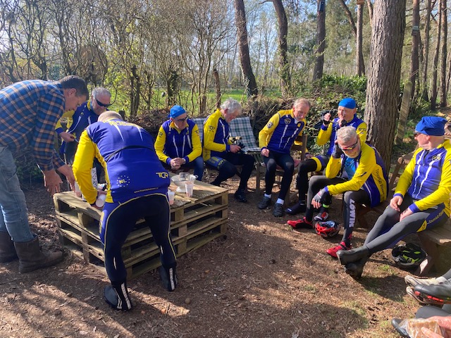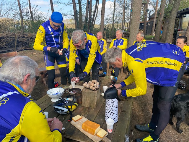 Een collega van Bennie runt hier een B&B en een manege. Hij heet ons van harte welkom en leidt ons achter de schuur waar de stoelen al klaarstaan in een kring gewoon in het bos maar wel lekker in de zon. Wat genieten is het hier. De paaseieren staan ons al aan te kijken op tafel. En die vinden na de koffie dan ook gretig aftrek.