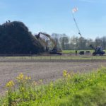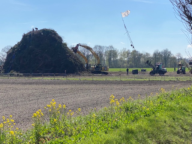 En dat kan geregeld worden. Verbaasd staan we te kijken hoeveel jongelui hier keihard werken om het paasvuur zo mooi mogelijk op te bouwen. De kraan die erbij staat valt gewoon in het niet.