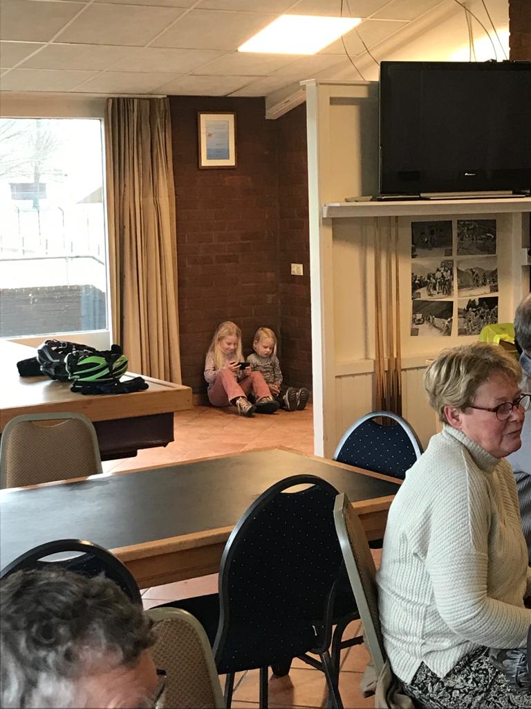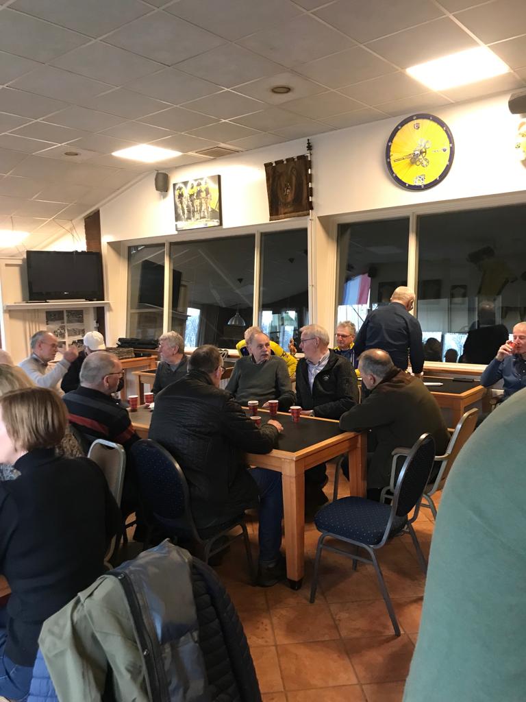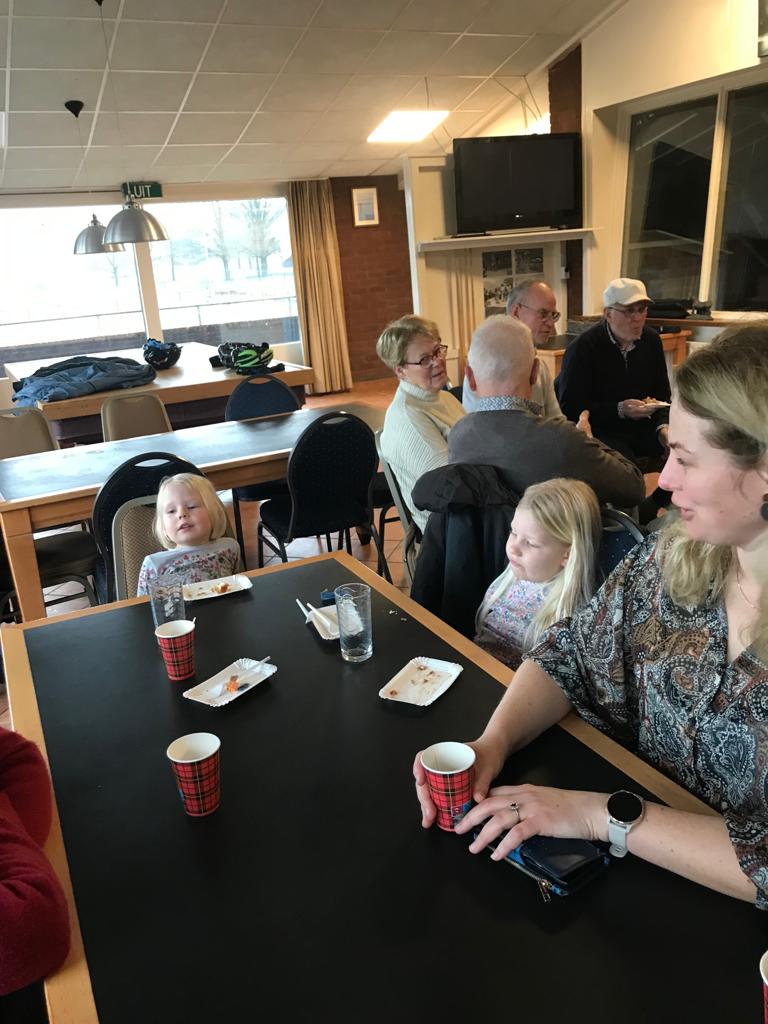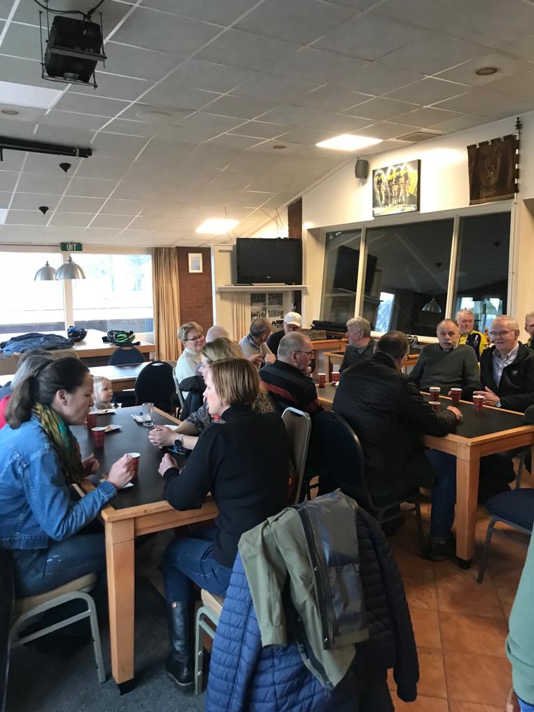 Meer dan 60 leden ( waarvan sommigen met aanhang en kinderen) genieten van de koffie en het gebak en natuurlijk de gezelligheid.