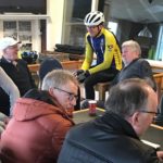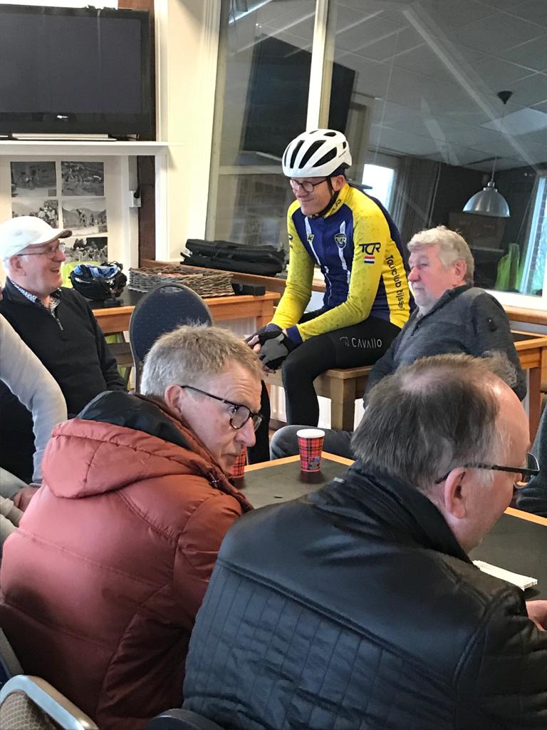 Om 9 uur zijn er 11 dapperen die hebben besloten toch maar te gaan fietsen. Bikkels! Ze vertrekken voor een korte rit met koffie en appeltaart in het vooruitzicht.