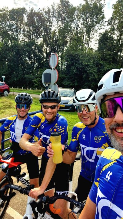En toen was daar de Peeskesbult vanuit ’s-Heerenberg. Nog eens 1,5 kilometer omhoog, geen muur maar een lange klim die de benen langzaam leegtrekt. Daar reed ieder in zijn eigen tempo omhoog, de cadans zoekend en wachtend tot het vlakker werd. Bovenop kwamen we weer samen. En precies daar volgde de beloning: een korte pauze bij ’t Peeske. Koffie, bidons vullen en genieten van het uitzicht over de heuvels en bossen.