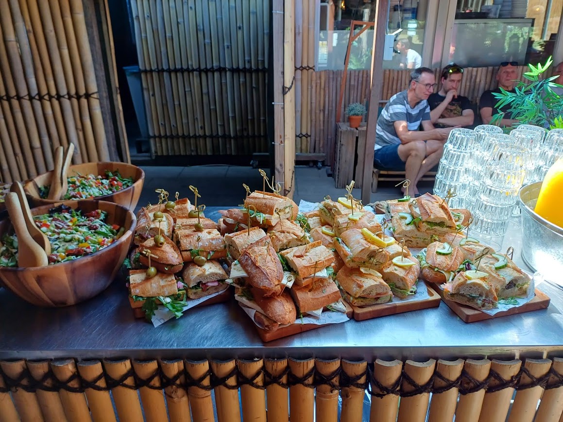 En dan het slotstuk: een buffet om je fietshelm voor af te nemen. Zoveel keuze, zo smaakvol, en zo goed verzorgd dat sommige renners twijfelden of ze überhaupt nog terug in de auto pasten. De penningmeester zal een flinke deuk in de reserve constateren. Delen door 300, valt het altijd mee 🙂