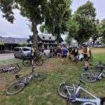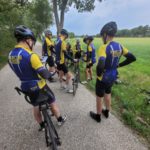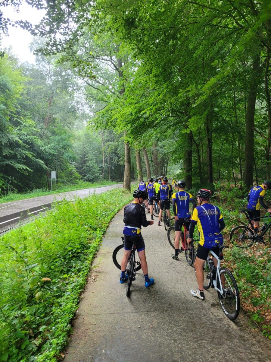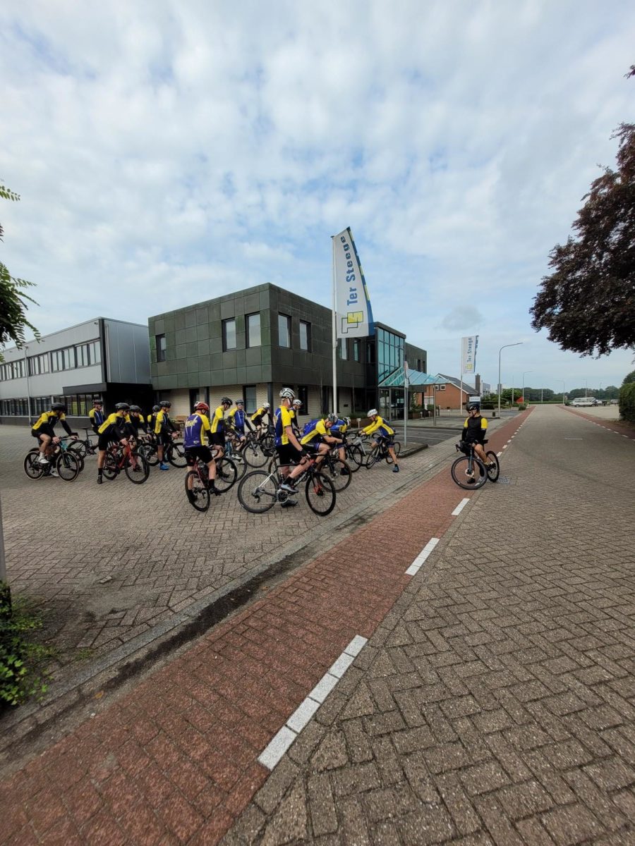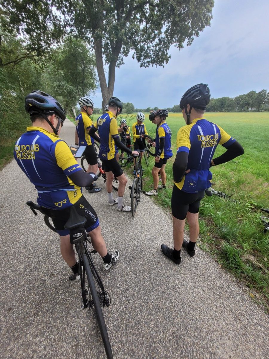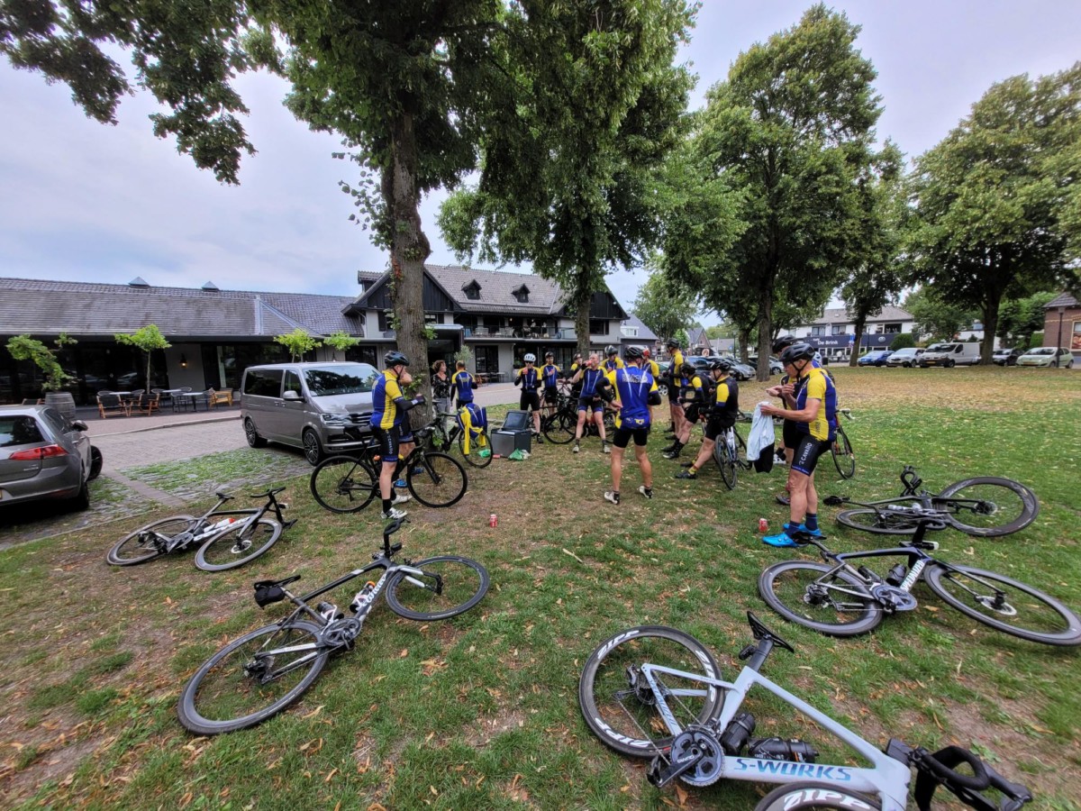 We vertrekken in alle rust via de Middeldijk richting het zuiden. Dus niet echt richting Hardenberg. Al slingerend door het Twentse landschap komen we langs Bornerbroek, Almelo, Mariaparochie en Langeveen en nu toch aardig in de buurt van Hardenberg. Na zo’n 70km gefietst te hebben staan we bij Ter Steege Hardenberg voor onze 1e stop. Hier staat Rudy ons op te wachten met een bak koffie en een heerlijke punt appeltaart. Top geregeld Rudy! Bij het bestuderen van de reeds afgelegde route komt er al een aardig ‘rondje’ in beeld. We vertrekken richting Dalfsen voor de 2e stop. Al slingerend over meerdere fietspaden komen we langs Dedemsvaart, Balkbrug, Nieuwleusen en Rutteveen. In Dalfsen aangekomen hoeven we niet echt te zoeken naar een plekje op het terras. Door het ‘vochtige’ weer is deze vandaag niet druk bezocht. Dus plek zat voor 20 man waar we ondertussen de tijd nemen voor de inwendig mens. Een broodje kroket, carpaccio of nog maar een punt appeltaart word met alle gemak naar binnen gewerkt. Hierna is het tijd om te vertrekken naar de volgende stop; Bathmen! Inmiddels is wel duidelijk dat we toch wat regen kunnen verwachten. En ja hoor. We krijgen vlak bij Wesepe een flinke douche. Dan maar even stoppen. Mede door de lekke banden komen we wat later dan gepland aan in Bathmen waar Ria ons staat op te wachten met een voorraadje cola en reepjes. Die gaan er wel in!