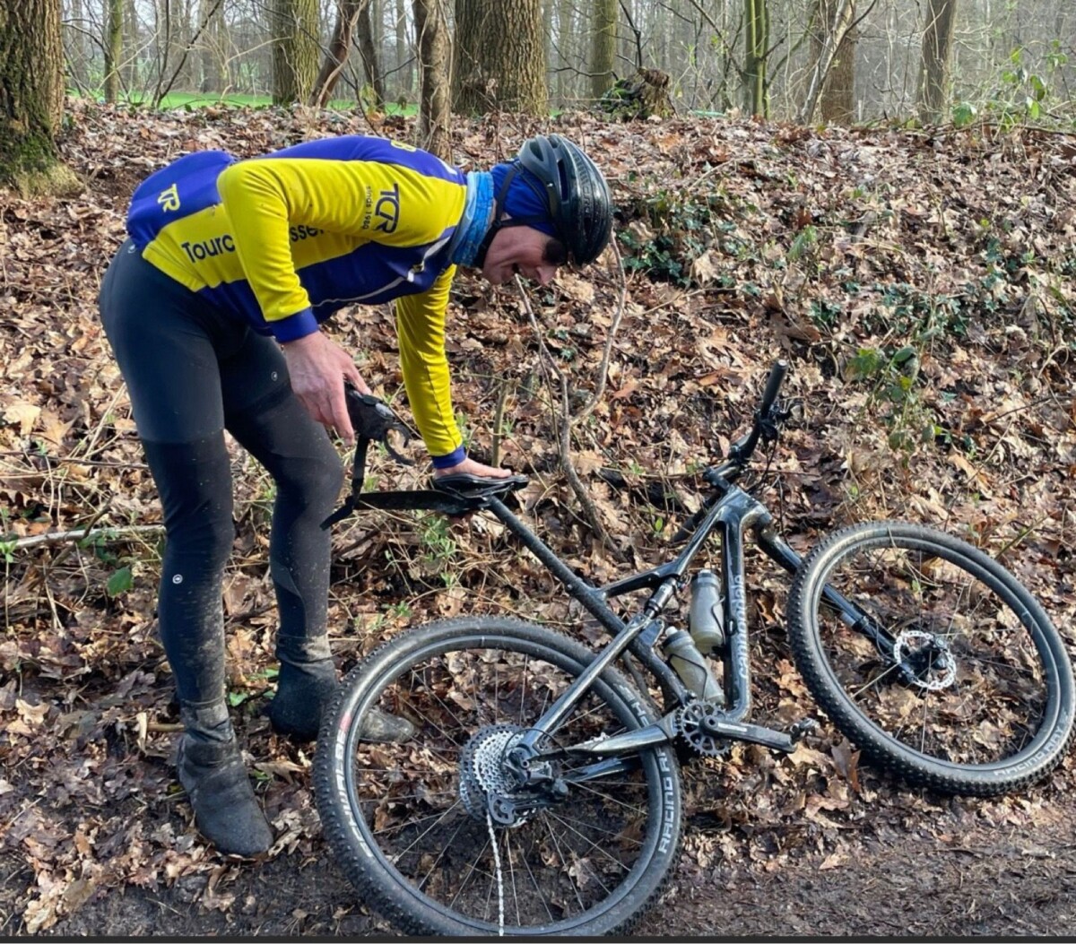 Omdat er regen wordt voorspeld laten we het bij één koffie. Nadat we buiten nog foto’s hebben gemaakt gaan we weer richting het oosten. Vanuit het klooster via mooie onverharde wegen naar het Overijssels kanaal. De hemelsluizen gaan langzaam maar zeker open. Uiteindelijk het kanaal over, onder Heeten langs, over het Markepad. We passeren restaurant Reimink en rijden over een fraai bospad. Dan rechts de Molenbeltsweg op, ook een onverharde weg die licht omhoog loopt. We hebben met elkaar afgesproken dat we geen namen zouden noemen en dat doe ik dan ook niet …. maar hier sprinten twee van onze groep naar boven en een van hen ( geen naam ….) breekt zijn ketting. Gelukkig heeft één van ons een passende kettingschakel. Uiteindelijk hebben we wel het gereedschap van een nabij wonende boer nodig om de schakel er op te krijgen. Daarna ook nog een lekke band die ter plekke niet te repareren is😒 . Zelfs na dit malheur, de ‘goed bedoelde’ opmerkingen over het materiaal😁 en de regen blijft de sfeer erg goed . Bij Espelo zien we dat ze alweer begonnen zijn met de paasboake. We nemen de Plaggenweg om de Holterberg te bedwingen en eindigen met de gravelpaden op de Ligtenberg. Het was weer genieten, zelfs met de materiaalpech.