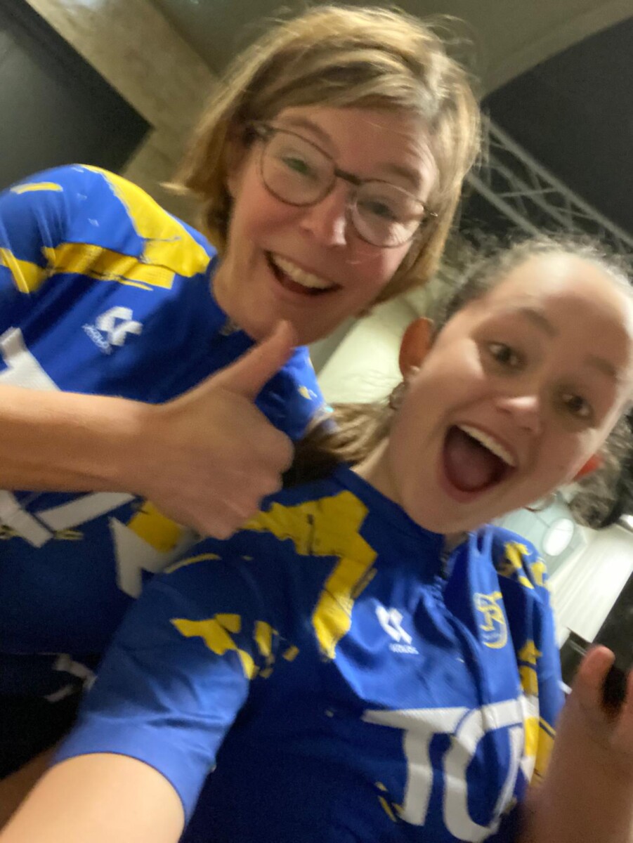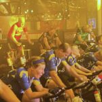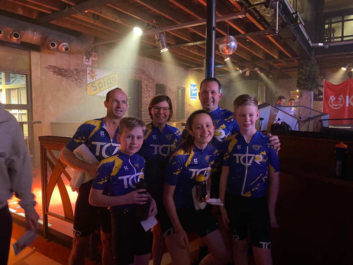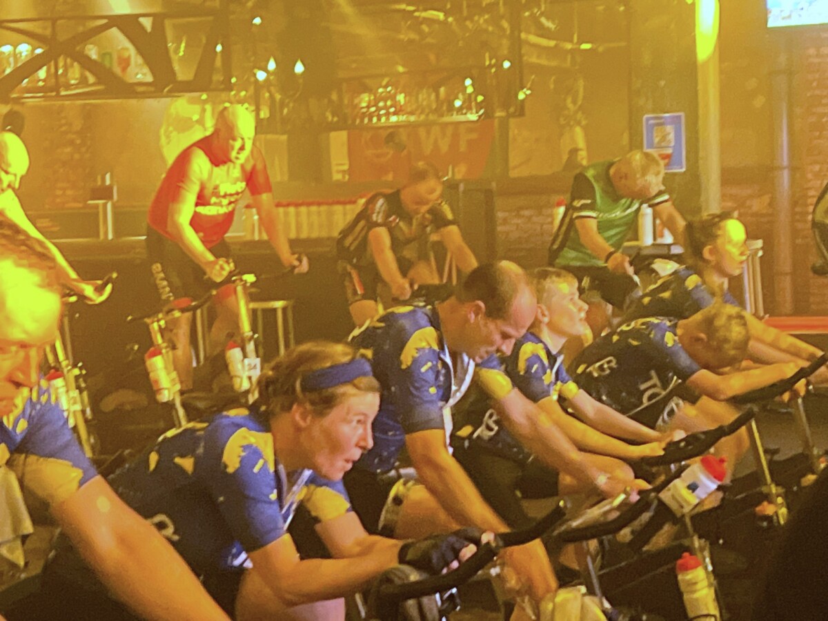 Een hele beleving voor de kinderen en voor ons. Dus vandaag geen natte modderpaden maar een schone ondergrond bedekt met een lichte waas van heel veel zweetdruppels. Na het aanmelden kunnen we gelijk plaats nemen op onze spinningfietsen. Even afstellen op de goede maat en fietsen maar. Net voordat we echt beginnen krijgen we een korte toespraak door iemand die ongeneeslijk ziek is. Dit maakt het direct wat persoonlijker en zwaarder beladen. Onze instructeur geeft ons een korte warming up en dan gaan we ook direct aan de slag. Voor mijn gevoel zijn er vele beklimmingen en weinig afdalingen. Af en toe mogen we even zitten, maar het merendeel hangen we boven het zadel. Onze jeugdleden geven geen krimp, maar volgen moeiteloos de gegeven instructies op en onderwijl blijven ze vrolijk praten. Met ons als begeleiders is het anders, Rene kijkt zo serieus, dat je haast zou denken dat hij aan het begin staat van een moeilijke toespraak voor een volle zaal mensen. Henriët zat naast mij en was helemaal stil, bedenkelijk vroeg ik; ” of het goed ging” en ze knikte volmondig zonder geluid terug. (Nog nooit meegemaakt) En mijzelf kon ik gelukkig niet zien!!