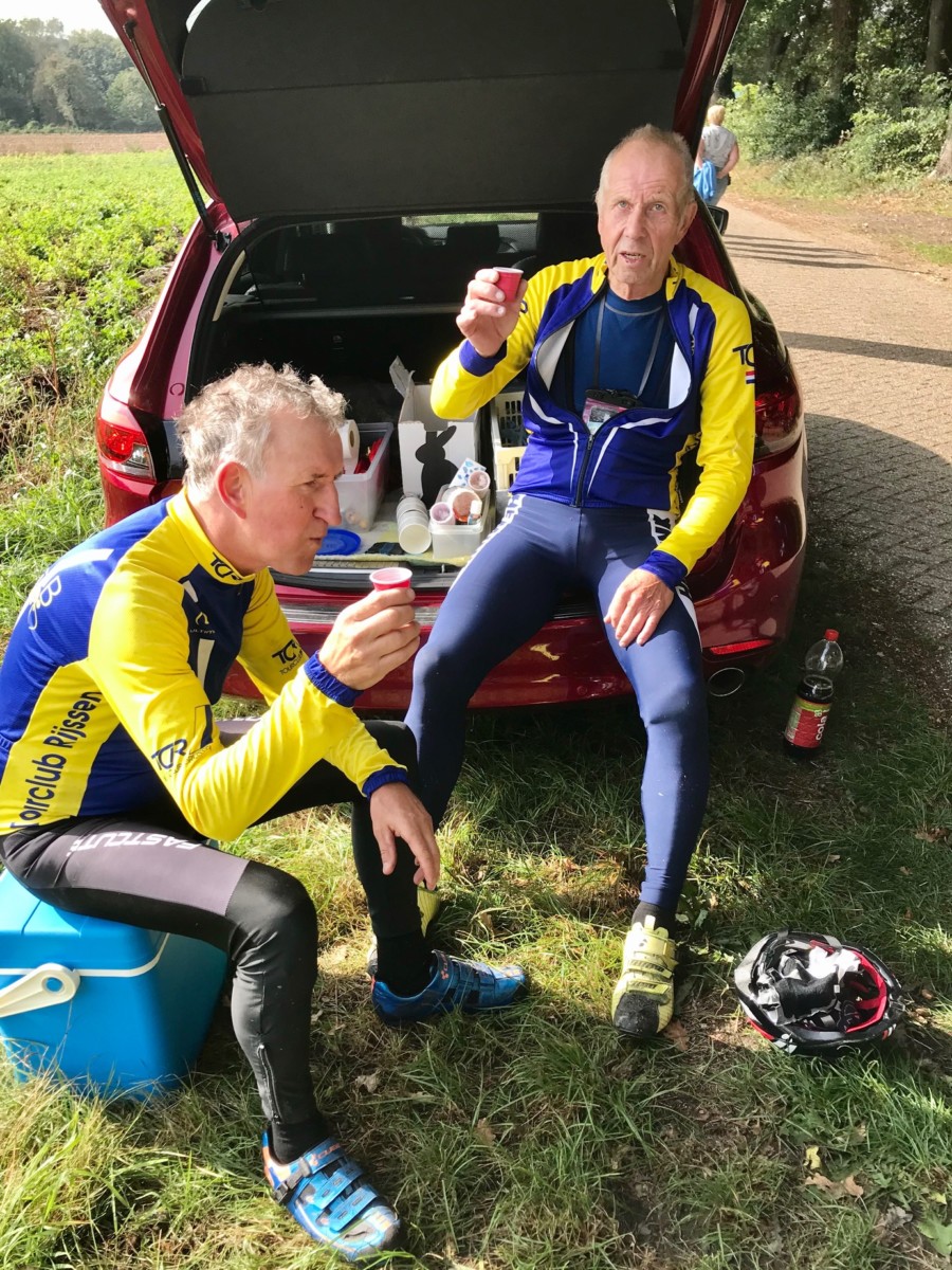 De tweede stop dient zich aan boven op de Markelose berg en hier staan Gerda en Henriëtte met mummelman, kaas en worst op het menu . Hier word ook duidelijk dat een aantal niet tegen drank kan want als Gerda vraagt wie het verslag schrijft steken ze allemaal een vinger vooruit in plaats van omhoog en je raad nu al waar die vinger naar toe stond. Na dit democratisch genomen besluit stapt iedereen weer op zijn fiets en vervolgen wij onze weg weer naar de laatste stop.