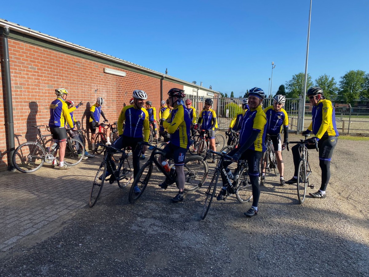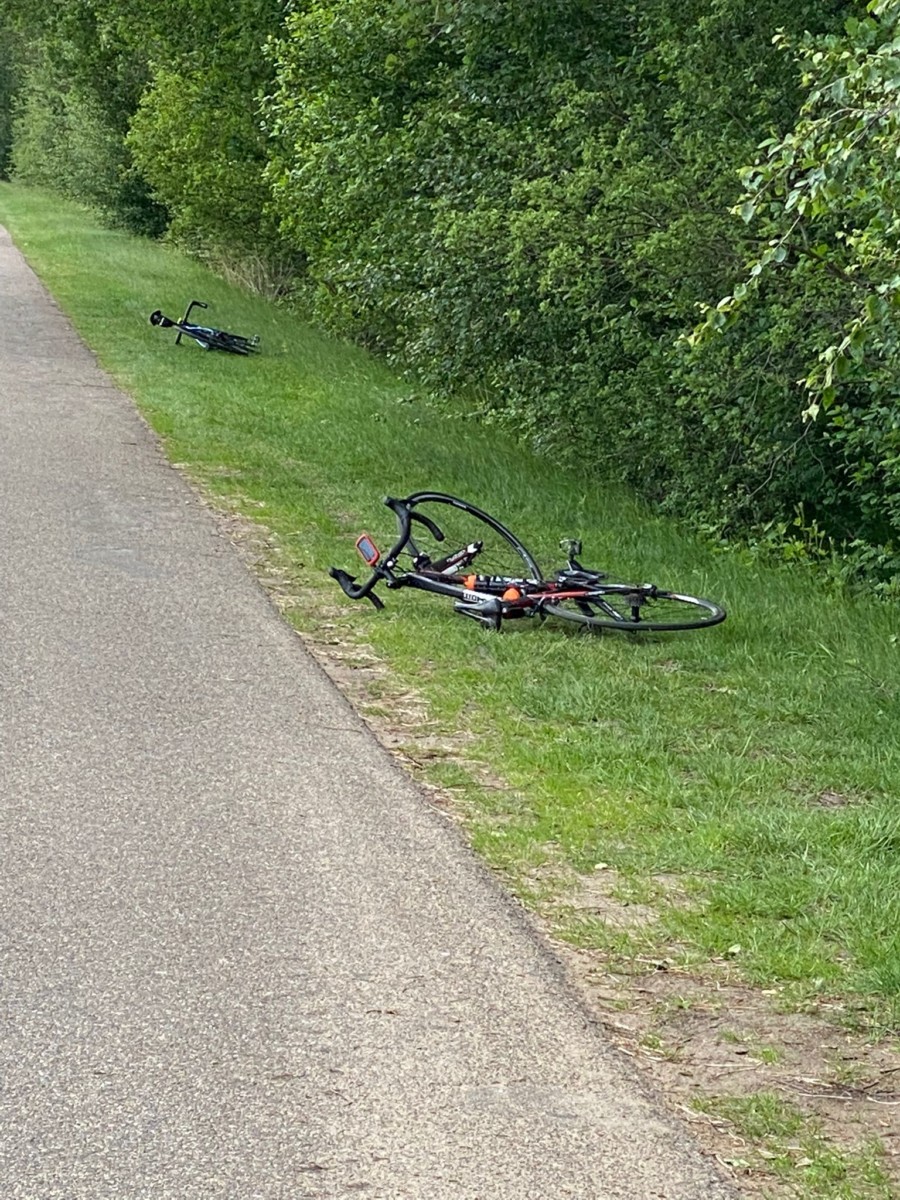 Ikzelf zit bijna achteraan en kan niet meer reageren, voor ik het weet lig ik op de grond. Mijn trapper zit in het achterwiel van Gerrit P. (Dat is mijn geluk) ik blijf eigenlijk hangen omdat Gerrit zijn fiets wel staande kan houden in eerste instantie, en ik daarom voorzichtig omval. Alleen de houder van de Garmin is kapot. Ik heb ook geen schade en kan gewoon verder. De koffiestop is nu niet ver meer.