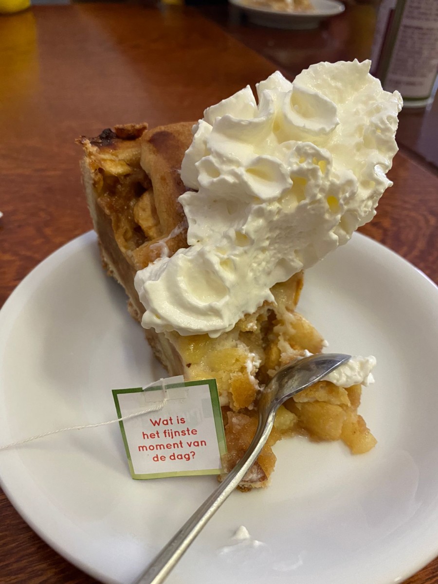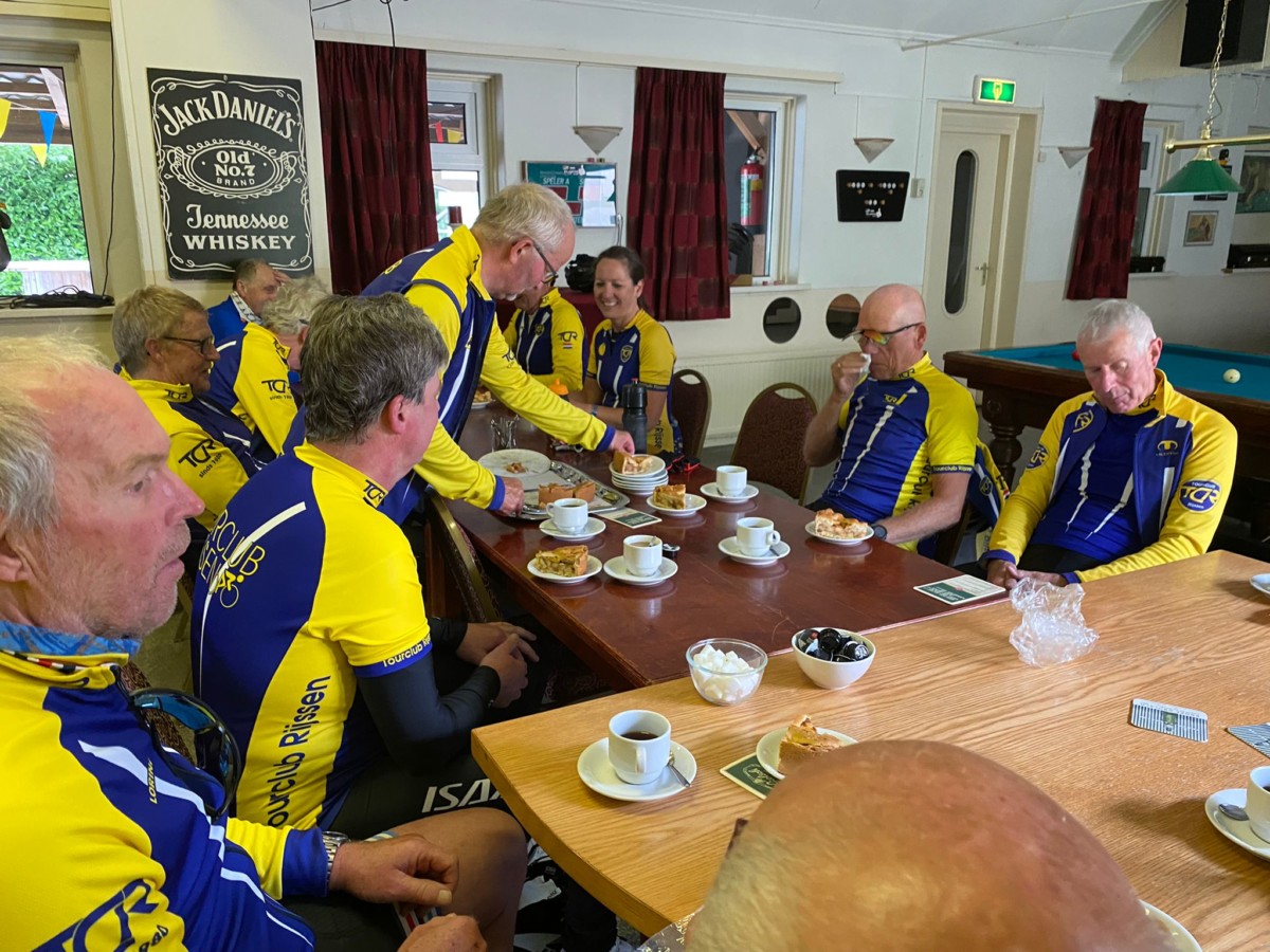 Aangekomen bij het Dorpshuis staat oom Piet ons al op te wachten. We mogen lekker binnen zitten want het voelt nog niet als zomer met de noordwesten wind veelal tegen. De koffie/thee EN een lekker stuk appeltaart met slagroom gaat er prima in.