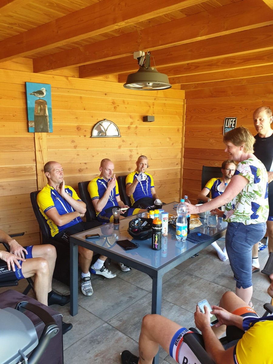 Eenmaal op de Posbank, na de eerste klimmetjes, was het tijd voor de koffie. Dat is ook het enige wat we hoefden te betalen want Bert was namelijk geslaagd voor zijn opleiding en trakteerde ons op appeltaart. De dag werd alleen maar beter. Bert had zijn goede nieuws nog niet aangekondigd of Wim nam het stokje over en vertelde dat er na afloop pannenkoeken voor ons klaar zouden staan. Special made by Ina. Wat ne mooin dag.