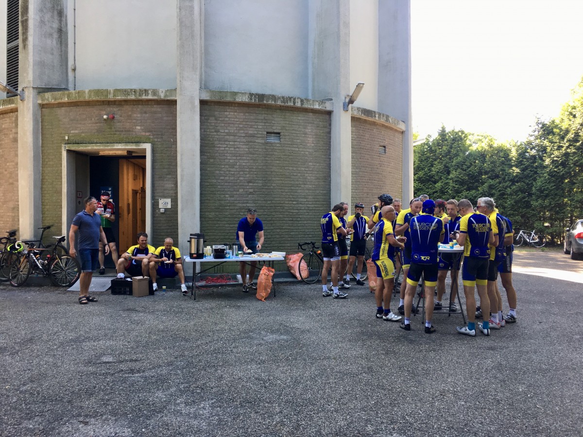 Daarna doorkruisten we Nettelhorst (wie kent het niet) en zetten we na Markelosebroek weer koers richting Rijssen. De onderweg ingelijfde gastrijder Jos, die bij zijn club HTFC een dagje vrij had genomen, draaide mee alsof hij al jaren meefietste. Hij kon onze discipline op de weg wel waarderen, altijd goed om te horen! De klok liep tegen tienen dus keken we reikhalzend uit naar de verrassingslocatie. Tourleider Erik Borghuis zei achteraf dat hij nog even had gedacht aan het nabijgelegen KI-station. Maar bij de televisietoren sloegen we opeens linksaf en troffen we de T1, die zich al tegoed deed aan heerlijke koffie en appelkruimelvlaai.