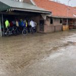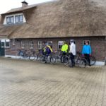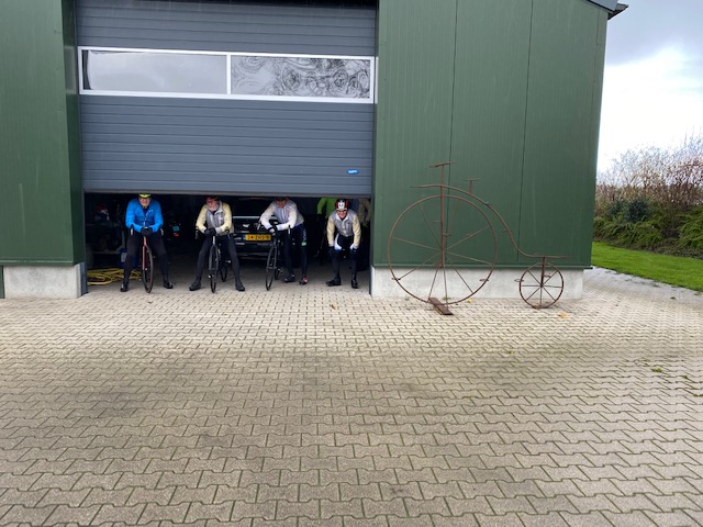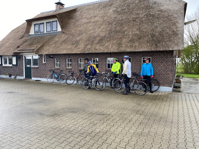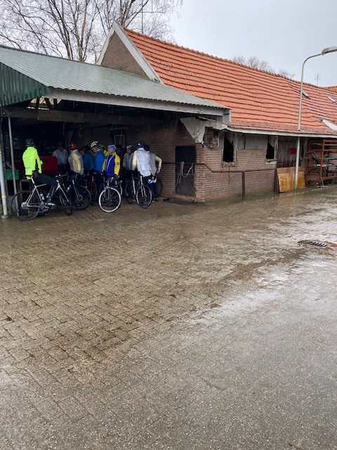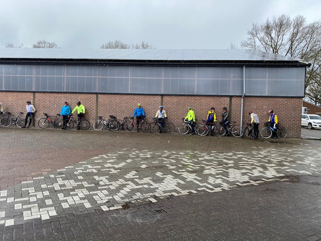 Wij pakken onze fietsen bij de horens en zitten net in formatie als het weer begint te miezeren en even later te plenzen.