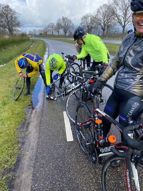 Vanaf dan gaat het goed met de buien en achterlangs Hellendoorn via Nijverdal naar Rijssen en daar gaat het alsnog mis, nu LEK, echt “gewoon” lek. Louis S. overkomt het. Met iedereen er om heen en alle goede raad ter harte genomen te hebben, wordt de band vakkundig verwisseld en kunnen we de laatste kilometers flierefluitend afleggen.