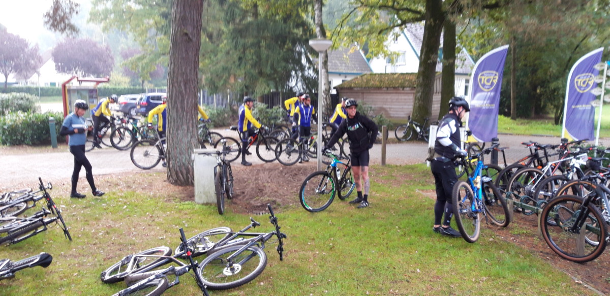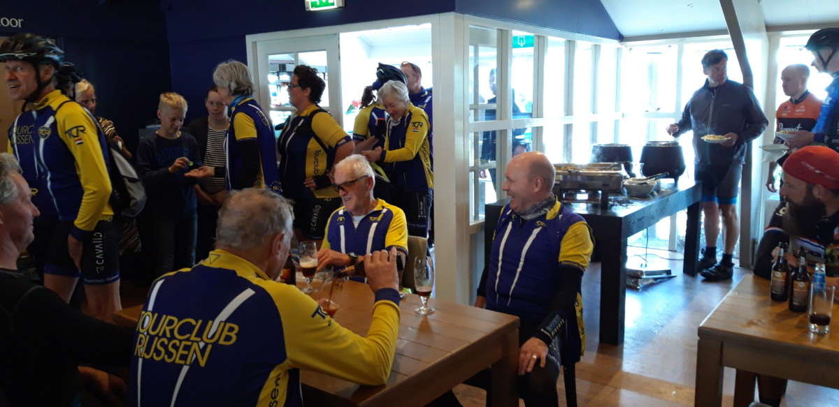 Onze fiets gestald hier werd goed opgepast om ons te melden voor de start. Het was al aardig druk even een bakje koffie en toen ons groepje compleet was gingen we van start. 3x Gerrit Dick en ik.
