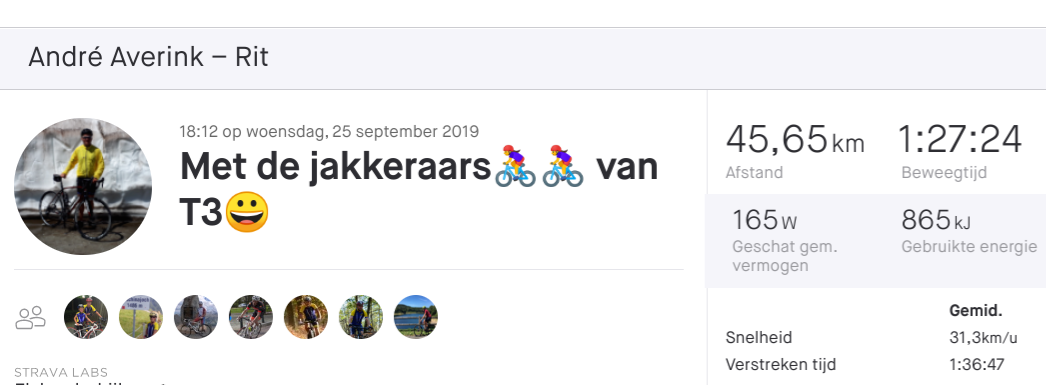 Bij het Tourhoes staat een mix van T3, T2 en T1. Het wachten is op de toerleider van de T3, die ook aanstaande zaterdag toerleider is. Een vlugge blik leert dat dit onze hoofdtoerleider is. Deze Henk is er niet, dus nemen we een andere Henk, die me de naam Goorman. Maakt niet uit, als de toerleider maar Henk heet. Onze Henk is een vermaard doortrapper en neemt de groep mee aan de hand voor de beoogde 39 kilometer. Helaas zorgt een lekke achterband van ondergetekende dat een flinke hap uit de 39 kilometer gehaald moet worden. Onder het motto ¨rust en kalmte kenmerkt de zeeman¨ wordt met behulp van Gerwin de band kwiek gewisseld, waarbij de recent tot Abraham getooide Wim Nooteboom de binnenband wisseling ondersteunt met enige niet geheel van nut zijnde verbale adviezen. We trappen het carbon weer in de door Henk bedoelde richting en telkens wanneer we denken dat we linksaf gaan terug naar Rijssen, sommeert Henk ons toch rechtdoor te gaan, een blik op de teller geeft bij het Hoge Hexel wel aan dat we de zonsondergang zeker niet halen. Onze Henk begint ook nattigheid te voelen en vertraagt niet. Zo te zien kan iedereen het tempo goed volgen. T3 rijders tooien zich niet voor niets tot ¨Jakkeraars¨. We draaien de Piksenweg op, steken via de Bruinehoopsweg (funny name) richting Notter/Zuna en naderen de Morsweg als de autolampen ons verblinden en een aantal van ons de fietslampen hebben ontstoken, zodat we enigzins veilig het laatste bordje Rijssen naderen. Listig schuift Wim Nooteboom naar voren om of als lead-out te fungeren of wellicht van kop af dit laatste zomerbordje ¨Rijssen¨ als eerste te passeren. Het is niet al te lastig om in het wiel van Wim te kruipen en de laatste meters Wim het achterwiel te tonen. Wim, bedankt. Mooie afsluiting van een mooi zomerseizoen. Samen met André Averink rij ik door het inmiddels donkere industrieterrein en via Het Schild naar het laatste klimmetje bij de Delleschool. De teller wijst een keurige 48 kilometer aan, dit inclusief lekke band. Wel raar is, dat onze Henk de hele dag op school zit, maar de formule (S=VxT-Lekke Band) blijkbaar nog niet geheel onder de knie heeft. Te overwegen is om in de maand september standaard de fiets te voorzien van voor- en achterlampje. Wel zo veilig.