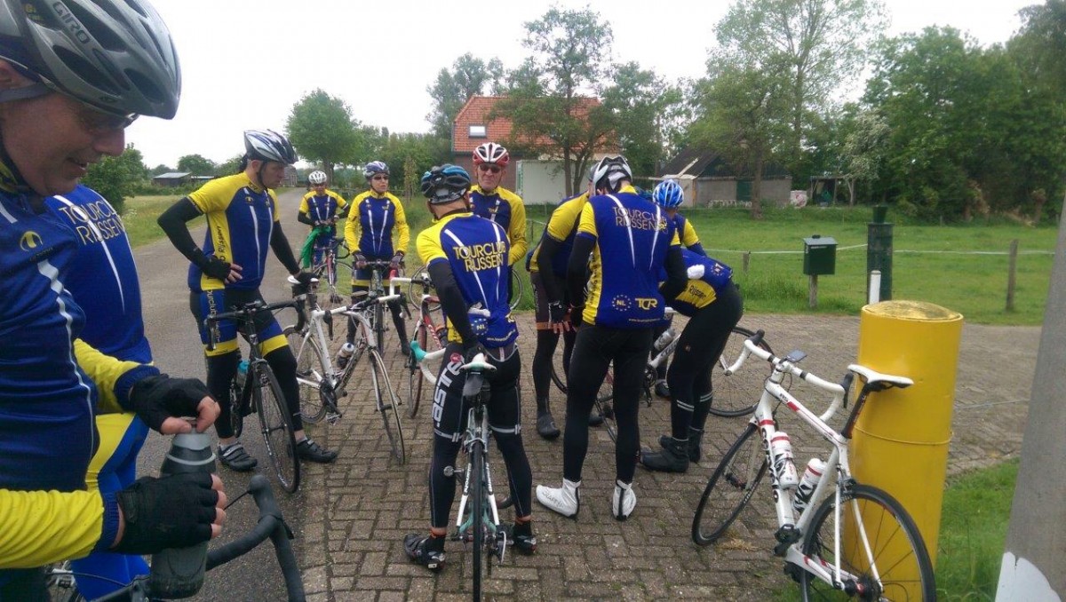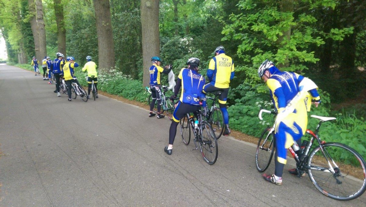 We hebben de gang er mooi in, maar wat de snelheid precies is weet ik niet omdat mijn teller kwijt is. Wel weet ik dat ik het verzet wat ik nu draai, dit seizoen nog niet vaak heb gebruikt. Maar dan rijd Peter Kamans lek. Dat men bij onze club elkaar graag helpt blijkt wel weer, want Peter kan met plezier toekijken hoe zijn band vakkundig met drie man wordt vervangen.