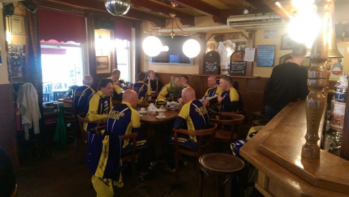 Beneden kleed ik mij aan en stap op mijn oude trouwe carbonros op weg naar de sporthal. Als laatste vertrekken we met 15 man de regen tegemoet die van het noorden langzaam naar het zuiden trekt. Met een klein beetje wind tegen rijden we bijna rechtstreeks naar Wijhe. Het weer is nog steeds goed en ik denk “als we het zo kunnen houden hebben we mooi mazzel”. Maar ja, vergeet het maar…. net voor Zwolle komen de regenjasjes tevoorschijn en houden we even stil om deze veilig aan te trekken. Op het industrieterrein van Zwolle zit onze tourleider niet op 1 lijn met zijn navigatie en moeten we even zoeken om de juiste weg naar het koffieadres in Hasselt te vinden. Hier aangekomen trekken we die natte zooi maar ff uit en doen ons tegoed aan een lekkere bak troost. Bij de handendroger in de wc staat Dekkers in een positie waarin je normaal gezien niet je handen droogt….. Hahahaha, “zo kunnie mooi de rugge dreug’n met dat dinge”