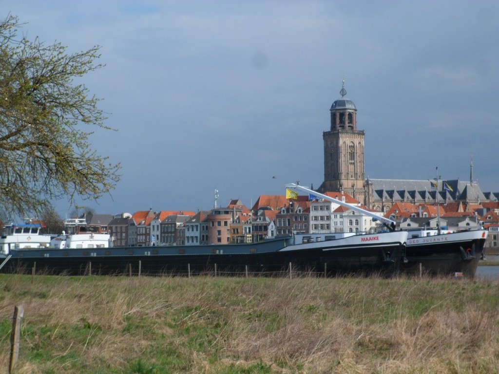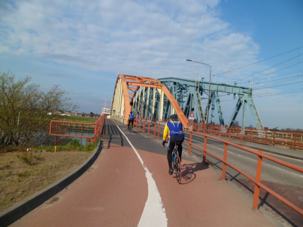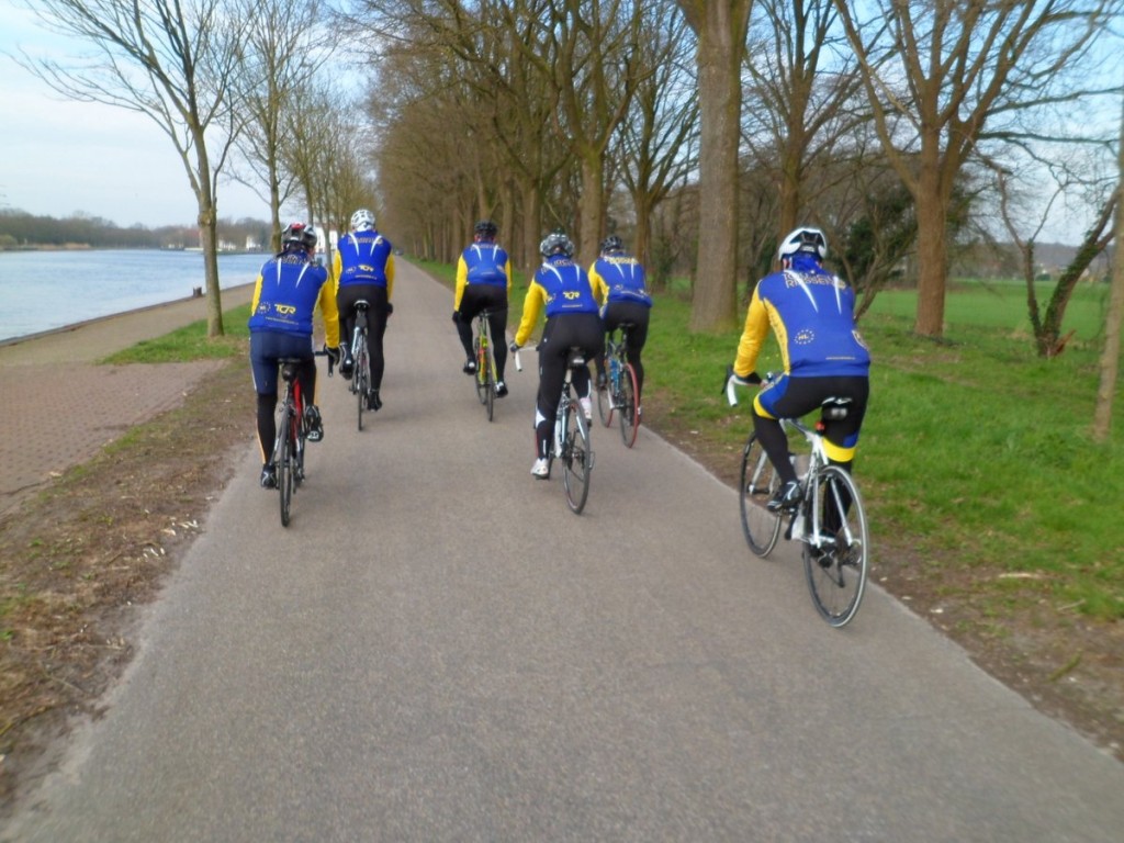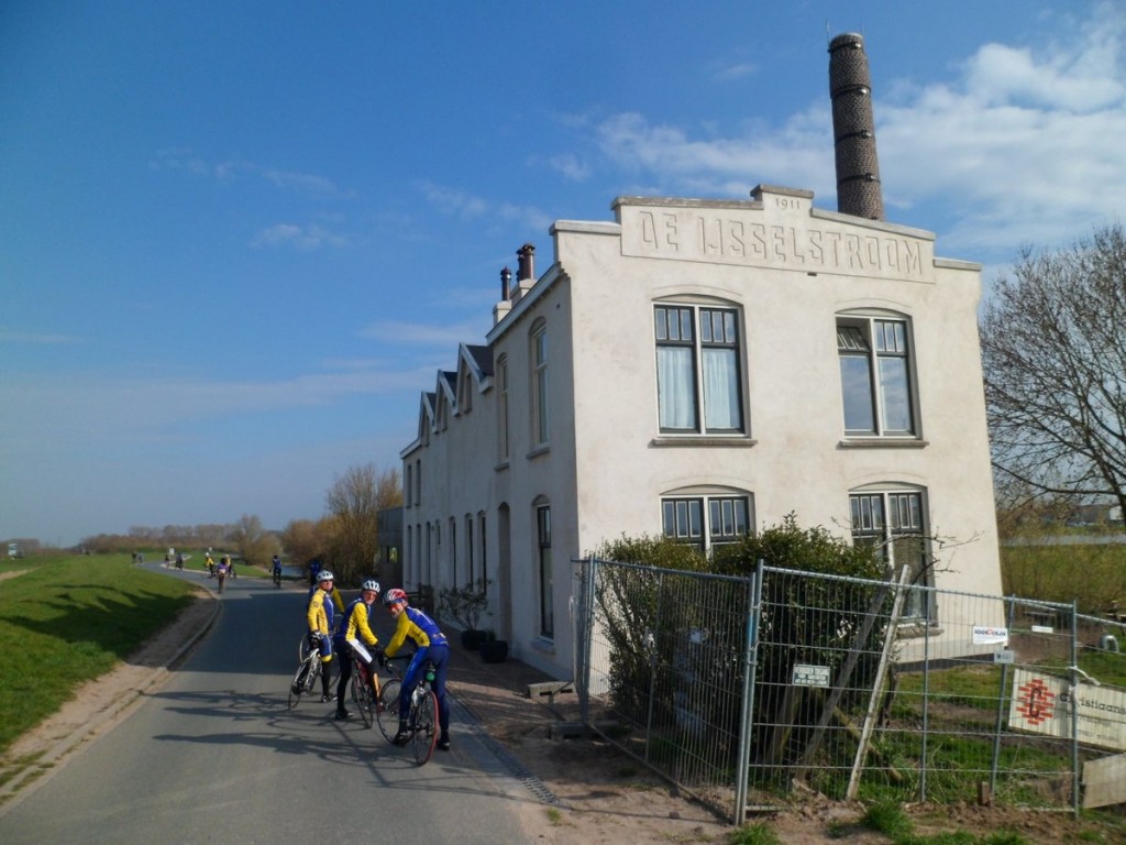 Heel mooi dat deze morgen 13 mannen en 1 vrouw klaar staan om onder leiding van Herman Baan de IJsseltocht aan te pakken. Het is voor T3 de eerste 80+-er van dit seizoen. We konden bij de sporthal al uitrekenen, dat een straffe tegenwind ons op het eerste gedeelte van de rit in het gezicht zou blazen. Dat bleek inderdaad het geval te zijn. We reden de klassieke route via de Poppe richting tv toren en staken de Schipbeek over bij de Rouwdaalterbrug. In ons midden fietste een Johan mee die anoniem wenst te blijven. Het schijnt dat Wim Spekhorst zijn verrichtingen via onze website regelmatig volgt. Deze Johan fietste de hele eerste helft van de route pal achter Gerrit Troost. Iedereen kent het spreekwoord:”Lange Troosten vangen veel wind.” En Johan profiteerde maximaal van het luchtledige dat achter Gerrit ontstond. In mijn ogen zweefde hij achter hem aan. Boze tongen in onze groep fluisterden dat dit zweven het gevolg was van de bacardi de vorige avond door hem genoten. Intussen waren we de Viersprong voorbij gereden en bevonden we ons in de buurt van het landgoed Vervolde. We zagen niet alleen mooie klassieke oude dikke eiken, ook een handwijzer verwees ons naar de dikste boom in het landgoed. We passeerden de boerderij met de naam Vennekotte. Hier woont onze plaatsgenoot Ria Markvoort zuster van ons lid Luuk. Zij probeert mensen duidelijk te maken, wat duurzaamheid betekent, en hoe je dat thuis in de praktijk kunt brengen. We fietsten om Laren heen naar het Twentekanaal. We bleven langs het kanaal rijden tot Eefde. Wim van de Noort fotografeerde de schepen in het kanaal en zocht impressies van het lentelandschap op. Ons peloton brak hierdoor in twee stukken. We passeerden de sluizen en Herman had ons reeds beloofd om enkele honderden meters te gaan veldrijden. Dat maakte hij langs het kanaal en tussen sluis en bruggen waar. Zutphen wachtte op ons. Van de mensen op de leugenbankjes vernamen we, dat we niet de eerste groep van de geelblauwe brigade waren die hier de IJssel overstaken. Aan de overkant van de rivier bij Hoven werden weer foto’s gemaakt. We waren op het keerpunt want de wind kregen we voor de eerste keer schuin in de rug. We fietsten prachtig door de uiterwaarden naar Voorst. Opnieuw oude karakteristieke eiken en mooie kastanje bomen die op ontploffen staan. In Voorst dronken we koffie bij het Pannekoekenhuis. Toen we daar wegreden stopten motormuizen uit Hoge Hexel om ook koffie te drinken. Herman had ons goed onder controle en stuurde ons snel weg van de N345 de uiterwaarden in. We kwamen veel wandelaars tegen op de IJsseldijken die evenals wij genoten van de voorjaarszon. Johan uit Enter kwam meer en meer tot leven. Hij wreef zich regelmatig met zichtbaar genoegen over zijn bacardi dijen. Na de Deventer hadden we de wind vol in de rug. In de stad hebben we ons keurig aan de regels gehouden. Maar buiten de bebouwde kom, kende ook T3 geen snelheidsbeperking. Bij enkelen van ons gaf de toeren begrenzer aan dat we iets minder zeil moesten zetten. Het ging in rechte lijn naar Rijssen. Een mooie rit,met dank aan de toerleider. En voor volgende week; met +16 T3-ers moeten we splitsen.