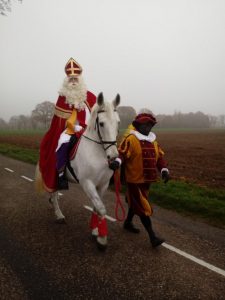 Gerard heeft weer een route voorbereid, maar Wout weet dat het vandaag de intocht is van Sinterklaas in Geesteren. De afgelopen twee jaar zijn we daar als weggroep ook naartoe gegaan, wat mooie foto’s opleverde. We laten onze kinderharten spreken en gaan richting Geesteren. Met 5 hebben we een taakverdeling dat Wout de route aangeeft en Gerard bepaalt wanneer er moet worden gedraaid. Gezellig pratend fietsen we via mooie droge binnenwegen naar Goor, Markvelde en zo zijn we binnen een uur in de buurt van Geesteren. Net voor Geesteren komen we op de Esweg het bonte Spaanse gezelschap van Sinterklaas en zwarte pieten tegen. Ook voor hen begint de ontmoeting met een aantal volwassen kerels uit Rijssen op wielrenfietsen al een traditie te worden. Van een afstand worden we al toegezwaaid en we horen ‘ja hoor, ze zijn er weer’ roepen. Ze hebben er duidelijk zin in om de kinderen van Geesteren een mooie intocht te geven. We krijgen pepernoten mee voor onderweg en we wensen elkaar succes. Tot volgend jaar, roept een zwarte piet ons na.