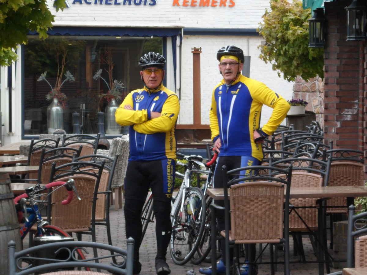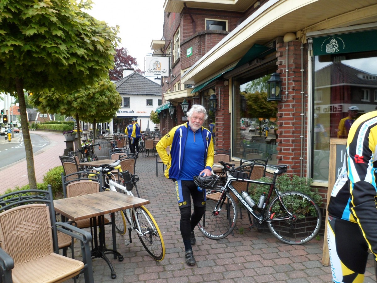 Hij had al pech gehad deze morgen en was weer naar huis gefietst om het achterwiel te vervangen zodoende kon hij aansluiten bij zijn leeftijd genoten. Na een klein half uurtje weer lek mijn buurman weer hij komt uit Enter ik dacht hij zal ons wal wat wiesmaakn nee hoor het zelfde wiel weer ik heb hem een nieuwe binnen band gegeven want hij had er niet zoveel bij zich.Wat blijkt onze monteur had het steentje tijdens de eerste lek niet opgemerkt en nu ging alles goed,de buurman zei: ¨as ik nou wier lek hebbe goak no thoes ik zegge dat dooj dus nit¨, het ging allemaal goed. De T1 met Peter Kamans kwam ons nog voorbij. In Zenderen koffie gedronken dat was geen succes het duurde errug lang voor we een bakkie hadden we hebben er dus ook maar 1 genomen later spraken we een T2er die had twee koffie betaald en geen kop gehad mooi dom.