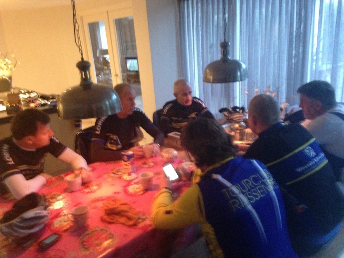 Ria Kienhuis ging op 30 dec naar het ziekenhuis met ernstige longproblemen. Gelukkig kwam ze op 8 januari weer in huis. Het Profokteam heeft op dinsdag 12 januari een fruitmand gebracht, zodat ze aan kan sterken. Voor Willy betekende dit 14 dagen de gedachten niet bij fietsen. Dat hij dit niet heeft verleerd bleek op zondag 10 januari toen hij weer in goede conditie aan kop sleurde over de bedieningsweg van Holten naar Rijssen. Het “oude vlees” is nog lang niet versleten. Clemence is vast besloten om nog meer kilo’s te verbranden en pakt elke gelegenheid om calorietjes in de brand te steken. Henrico heeft na de jaarwisseling ook de knop omgezet en zit nu aan het water en weigert elk IMG_1438ander voedingsmiddel, dan wat het boek van Sonja dicteert. Bart weet te vertellend dat hij ondermeer een paprika meeneemt naar de bouw en is in de eerste week van januari 1,5 kilo kwijt. Gerrit gaat gestaag door met teveel kilometers maken en zal hoe dan ook weer opgebrand zijn als de Marmotte begint. Dan hebben we nog onze ondoorgrondelijke, ons steeds verbazende Jerommeke Klomp. De kilo’s vlogen er begin december af, daarna stabilisatie, een hele goede timetrial tijdens de virtuele tijdrit bij Bloemendal en gelijktijdig een rustperiode van wegfietsen. Op 2 januari voor het eerst weer mee, maar toch moeite met uitgeruste benen om het tempo te volgen, een week later “geen zin” om het zondagrondje te doen, is hier sprake van misleidingstactiek ?