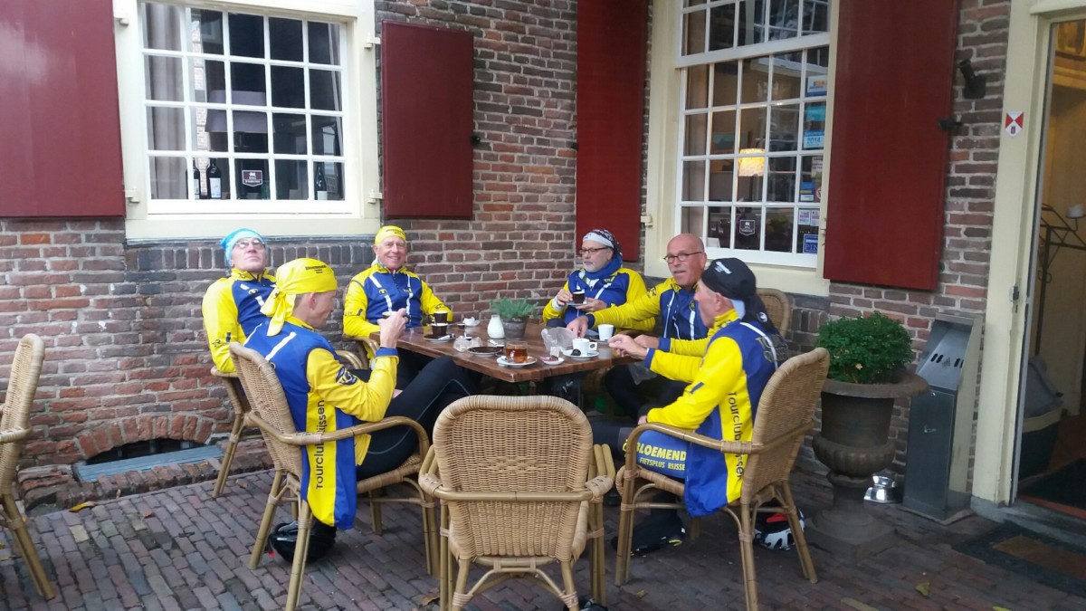 Op de weg van Markelo naar Rijssen mag ik nog een keer op kop, waar ik vol goede moed aan begin. Ik klets wat terug tegen mijn medekopgenoot (is dat Nederlands?) en ineens brult de tourleider dat ik achter hem moet komen fietsen. Verschrikt voldoe ik aan zijn verzoek en kijk snel op m’n km-teller: 23.5. Oei, inderdaad maar beter als ik er even achter fiets. Wim geeft een bemoedigende schouderklop, en Gerrit kan tussen zijn ademhalingen door zeggen dat ik niet de enige ben die het moeilijk heeft. Altijd fijn om te horen!