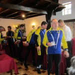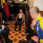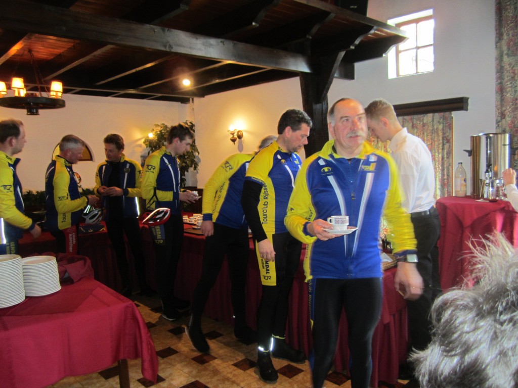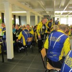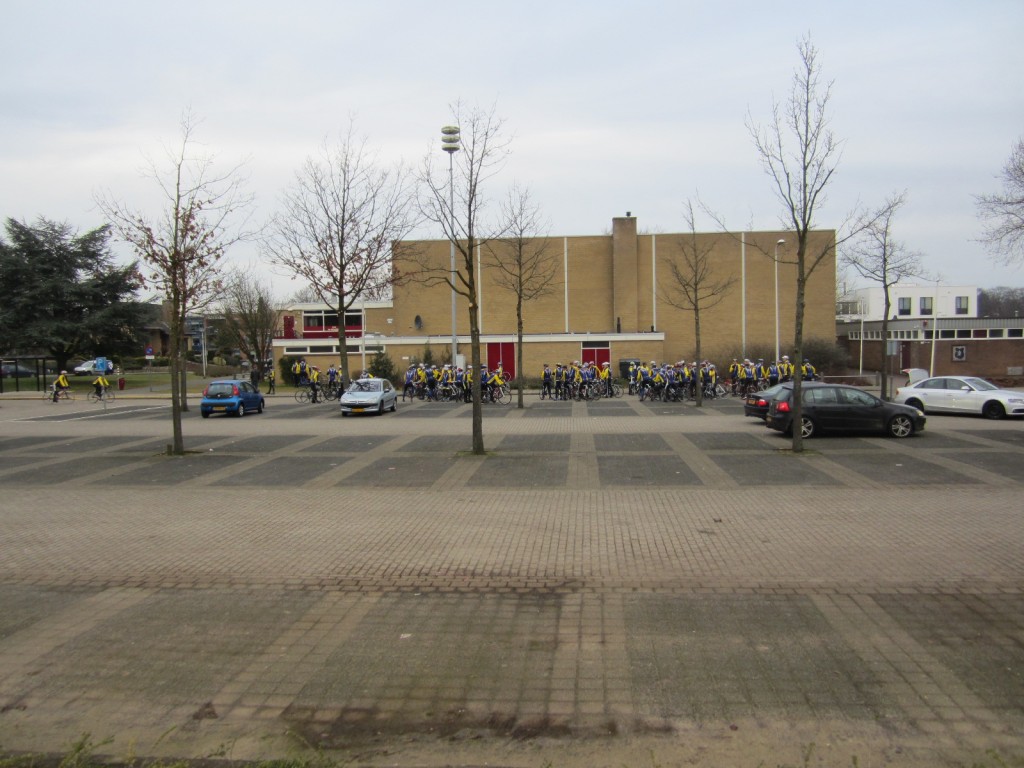 We vertrekken vanuit Enter al met 10 man/vrouw richting de sporthal. Hier is het al vol met veel geel/blauw en van alle kanten komen er nog meer. Er was voorspeld dat de temperatuur lekker zou oplopen in het weekend, maar daar is deze morgen nog niet veel van te merken. Het is om negen uur nog maar zo,n 4 graden. Maar het is droog en veel leden hebben er weer zin in. Ik schat dat er deze morgen meer dan 100 leden staan die deze morgen lekker willen fietsen.