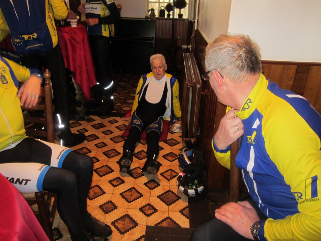 Eerst moeten we nog op de foto voor ons “smoelenboek”. Per groep worden de foto’s gemaakt door Dennis Wessels. Dan gaan we op pad. De T2 bestaat deze morgen uit 30 leden, die even later in tweeen wordt gesplitst. Bennie A. is de toerleider in de eerste groep. We gaan over de Borkeld richting Holten, Bennie is vergeten dat daar deze morgen de Enduro wordt verreden, maar dit geeft geen problemen. Hoe en waar we gefietst hebben weet ik niet, maar wel weet ik dat de TV toren regelmatig in en uit beeld verdwijnt. De contacten worden weer hersteld met de leden die deze winter niet het bos in zijn geweest met de TCR. De morgen vliegt voorbij, we komen al aardig in de buurt van ons koffieadres, nog even oversteken en dan zijn we er, maar daar gaat het mis. Han  Albach remt iets te laat en raakt de derailleur van Johan Krake en valt. In eerste instantie lijkt er niets aan de hand, we fietsen gewoon naar “de Pothoek” maar daar wordt de pijn aan zijn heup toch echt ondraaglijk en kan hij niet meer op zijn benen staan. Er wordt besloten om de ambulance te bellen. Henriette die de ambulance ziet staan merkt terecht op dat deze ambulance wel de juiste TCR kleuren heeft, dat dan weer wel!!! Han wordt meegenomen voor onderzoek en wij gaan nog een rondje fietsen om dan aan te belanden bij de Langenberg. Hier worden we voorzien van een hapje en een drankje en kletsen we gezellig na. Ik probeer te mensen zo hier en daar nog te enthousiasmeren voor rondje Nederland en voor de opgave voor de start van de Tour de France. Een prima begin (behalve de val van Han dan) voor hopelijk een goed fietsseizoen.