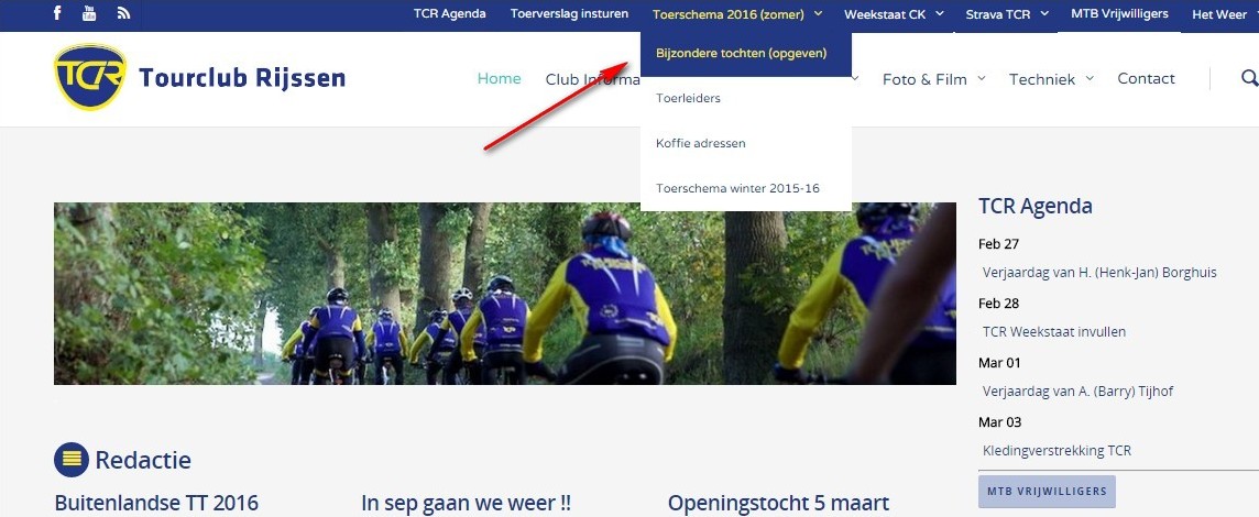 Onder het toerschema 2016 (bovenste menuregel) is een menu item “Bijzondere tochten”, hier komen ook de eendaagse tochten te staan, waarvoor een opgave formulier van toepassing is (Tecklenburg, Jaarlijks Uitstapje etc.)