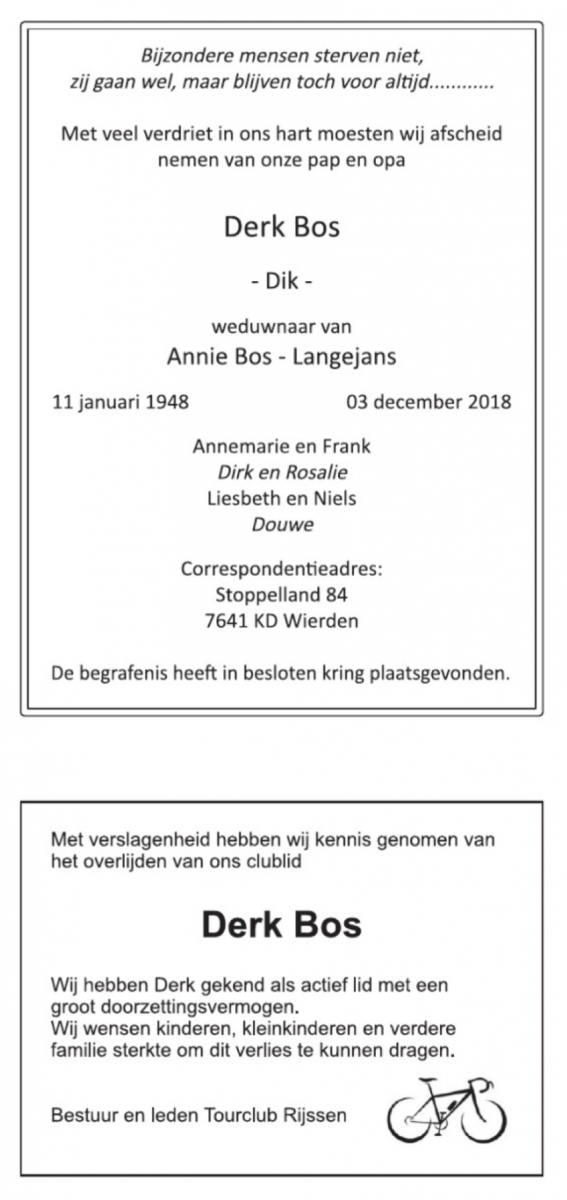 Na een lang ziek zijn, sinds november 2016, heeft Derk de strijd tegen leukemie verloren. Derk kreeg leukemie kort na het overlijden van zijn echtgenote Annie. Na intensieve chemotherapie werd Derk “schoon” verklaard en begon een periode van herstel. Afgelopen september, tijdens de jaarlijkse fietsweek met zijn toerfietsmaten, werd Derk opgenomen in Lourdes met longklachten. Nadien, eenmaal thuis, bleek dat de leukemie was teruggekeerd. Derk overleed afgelopen maandag in het hospice in Haaksbergen op de leeftijd van 70 jaar.
