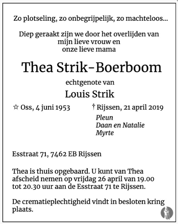 Condoleren bij het overlijden van Thea Strik Op 1e Paasdag is Thea Strik, de echtgenote van ons lid Louis Strik, na een ernstige ziekte overleden. De crematieplechtigheid vindt in besloten kring plaats. Gelezen: 632 Door Gerrit Wessels|2019-04-29T23:34:02+02:0022/04/2019|Redactie|Reacties uitgeschakeld voor Condoleren bij het overlijden van Thea Strik Deel dit verhaal, kies je platform! WhatsAppE-mail