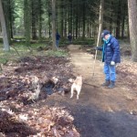 Met de aanleg is vandaag begonnen, een flink aantal vrijwilligers was om 0900 uur aanwezig in het soweco gebouwtje op de splitsing van de Korteboslaan. Begonnen werd met koffie en al snel verdween de meute richting het bos waar het kraantje gereed stond voor de eerste meters. Zoals gebruikelijk bij TCR was de stemming opperbest en na een korte instructie van Patrick Jansen ging het van start. De meesten verdwenen huiswaarts, want met een man of 5 is het goed te doen om de kraanmachinist bij te houden. In de loop van de middag bleek dat een flinke vordering was gemaakt. De bedoeling is dat overblijvende wortels worden verwijderd, hier kun ook prima een hond voor inzetten. Tenminste Kyra bleek aanzienlijk sneller met de bek te kunnen werken dan Andries met de schop en zaag. Opvallend was dat de route overal dwars doorheen gaat, zelfs een grote Rododendron werd doorklieft. De eerste 400 meter liggen er in, en Patrick heeft er absoluut kaas van gegeten, want hij weet op verrassende wijze elke kuil en bocht te benutten. Tussen de middag is er soep en brood en regelmatig koffie. Mochten er nog liefhebbers zijn om mee te helpen, vul het formuliertje in. Henk van Pijkeren verwerkt dit in het overzicht. In hoeverre er ook op zaterdag hulp nodig is, wordt in de loop van de week bekend.