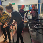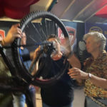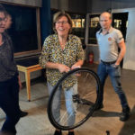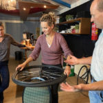 Janine begint en gelijk hebben we al problemen om de buitenband eraf te krijgen, nadat we allemaal de kans krijgen om het ook te proberen (Atb) lukt het uiteindelijk toch en begint het echte werk. Binnenland eruit, nieuwe band beetje oppompen en er weer in leggen en dan de buitenband er weer op zien te krijgen, uiteindelijk lukt dat nadat Mirjam er zich even mee bemoeit. ( zij moet gewoon altijd met ons mee, dan hebben we geen probleem 😉.