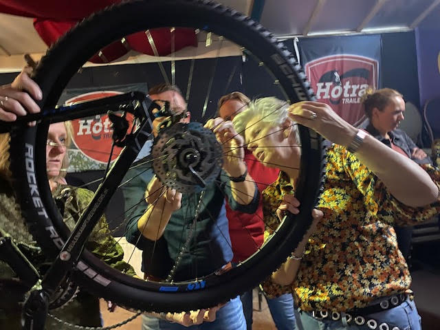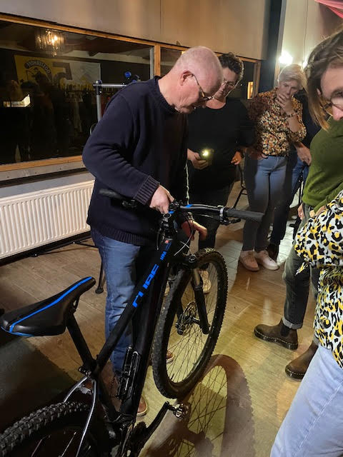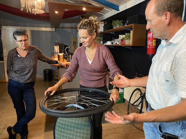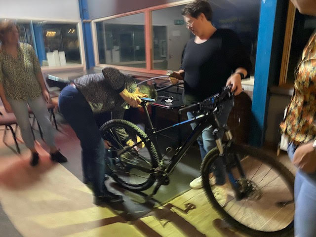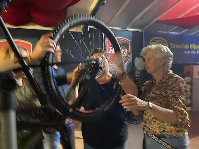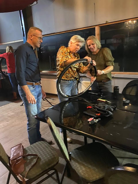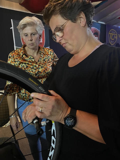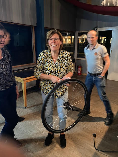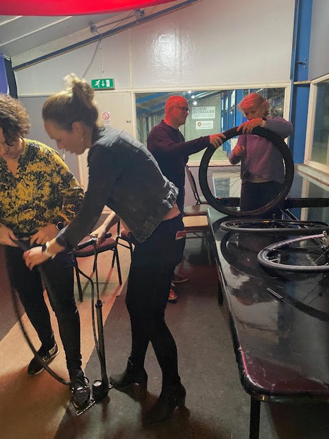 Janine begint en gelijk hebben we al problemen om de buitenband eraf te krijgen, nadat we allemaal de kans krijgen om het ook te proberen (Atb) lukt het uiteindelijk toch en begint het echte werk. Binnenland eruit, nieuwe band beetje oppompen en er weer in leggen en dan de buitenband er weer op zien te krijgen, uiteindelijk lukt dat nadat Mirjam er zich even mee bemoeit. ( zij moet gewoon altijd met ons mee, dan hebben we geen probleem 😉.