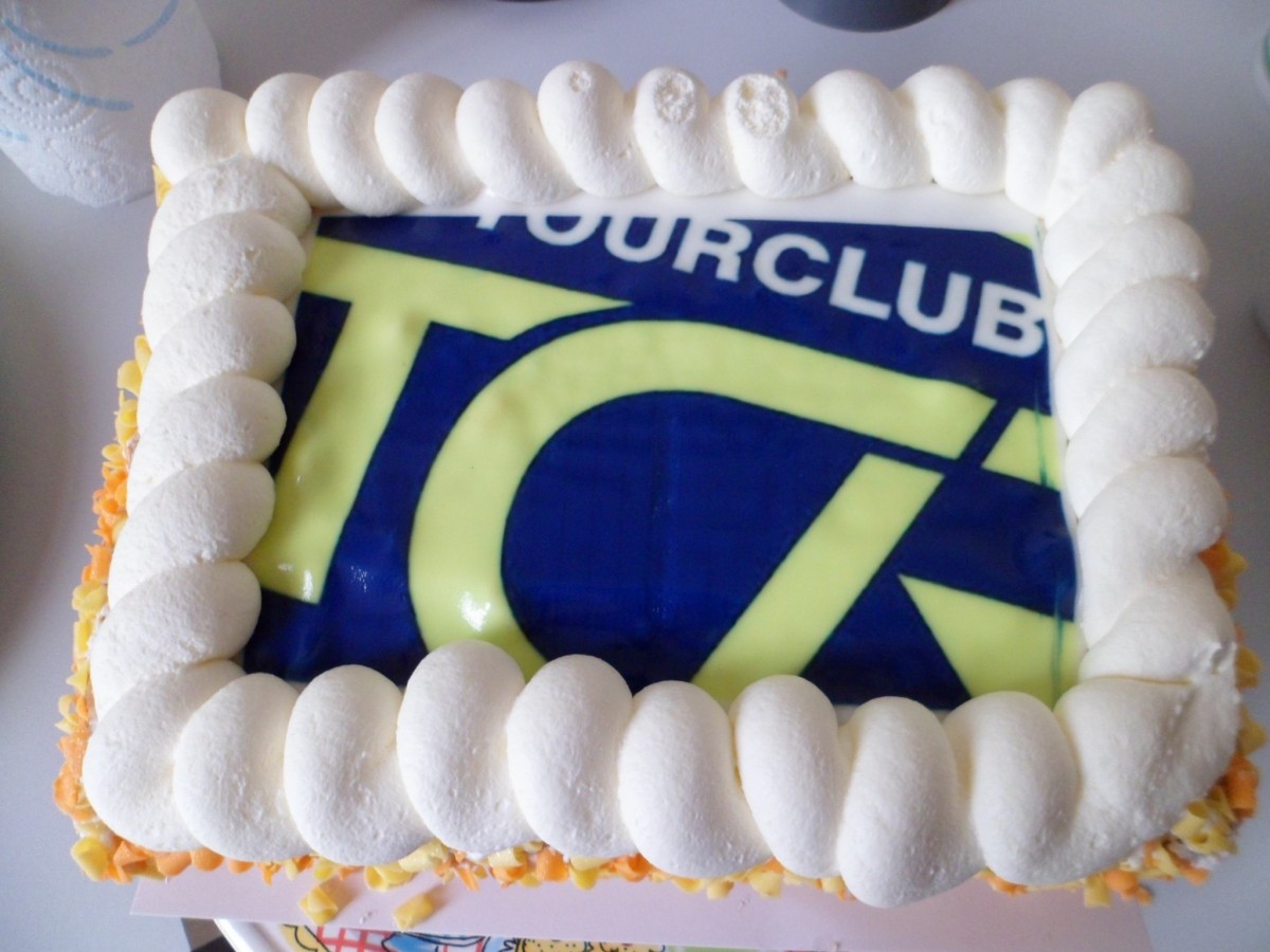 Zijn dochter heeft eerst een groepsfoto op de stoep gemaakt van ons, waarna de koffie klaar stond met gebak en wat voor gebak met het logo van TCR. prachtig en lekker.